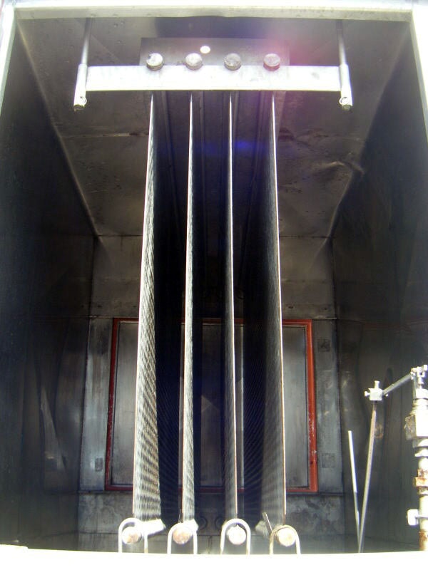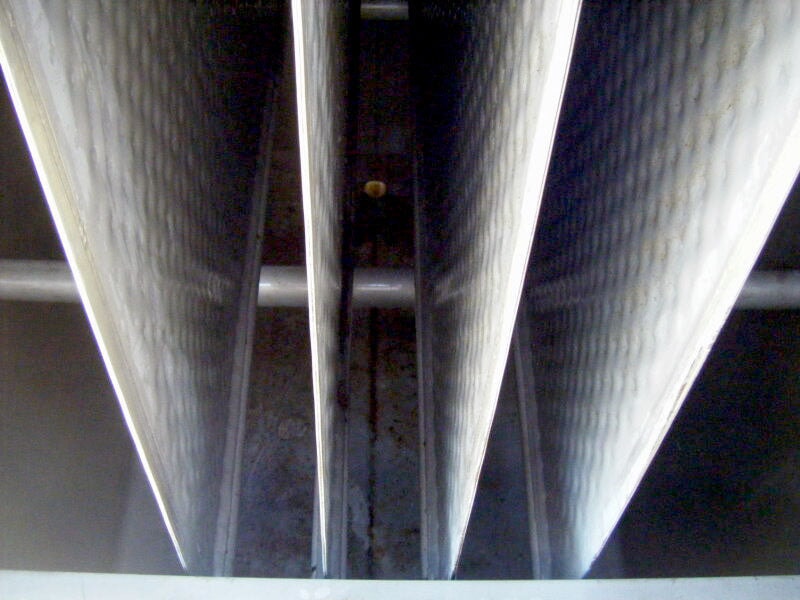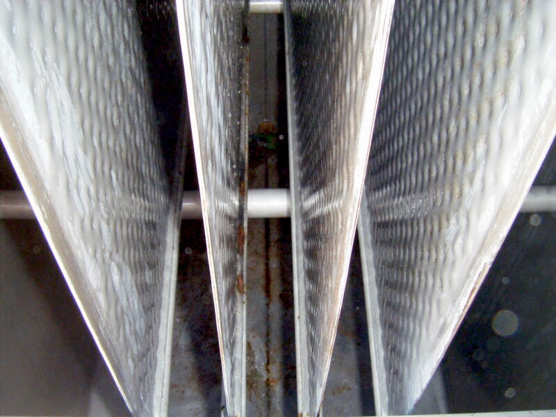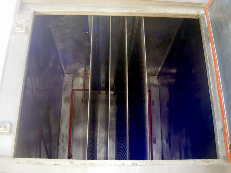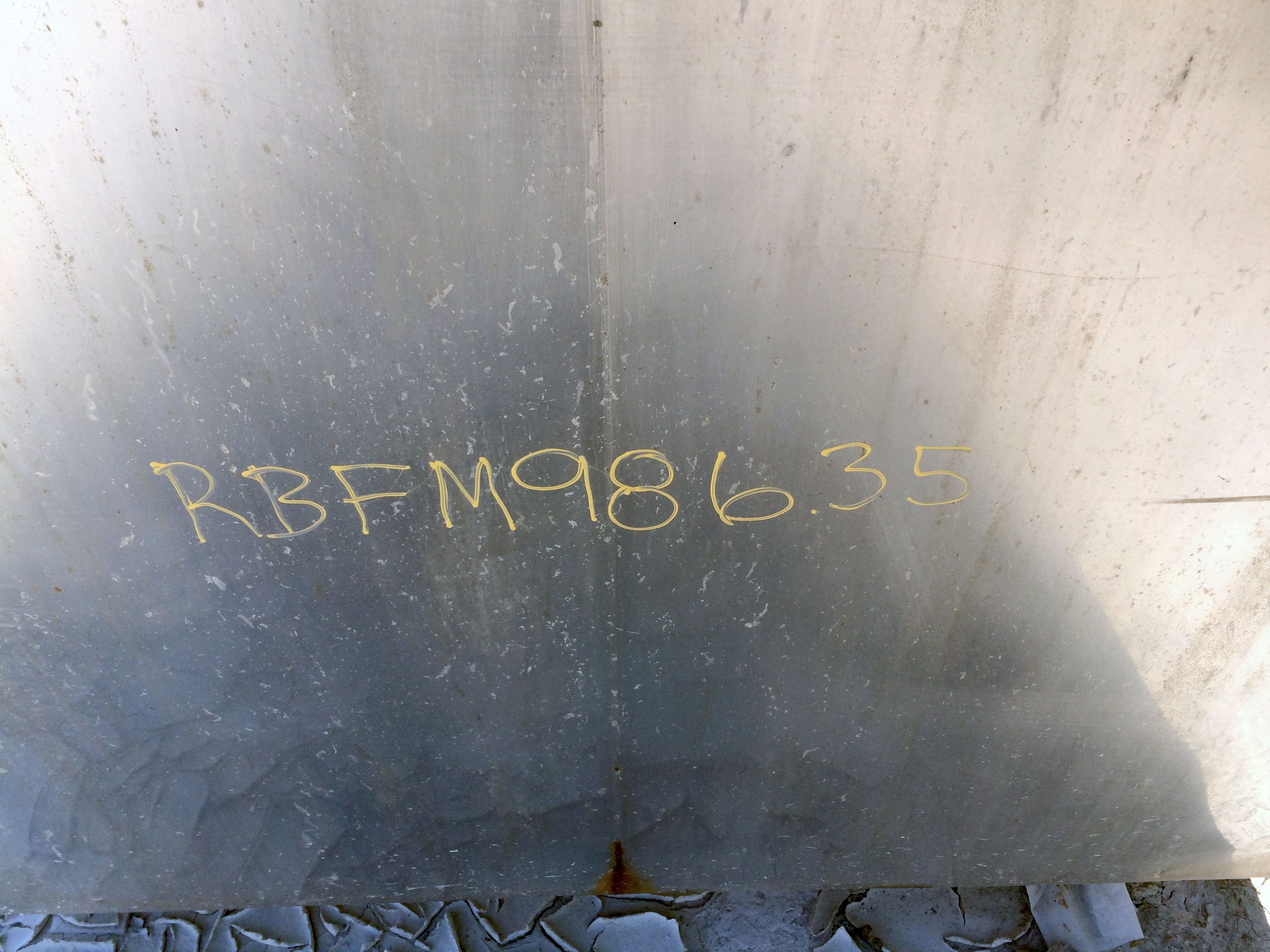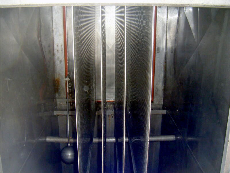 Dairy Equip. Co. Falling Film Plate Chiller. Certified by Dairy Equip., Co. Serial: 61873-14 and 61873-16. MAWP 250 PSI at 200F. MDMT -20F at 250 PSI. Year: 1989. Number of dimple plates: 4. Two nameplates are missing. Plate dimensions: 5 ft. 9 1/2 in. L. x 3 ft. 10 1/2 in. W. Collecting tank-800 gallons. Inside tank dimensions: 6 ft. 4-1/2 in. L. x 4 ft. 1 in. W. x 4 ft. 3-1/2 in. H. Inlets: (2) 3-1/2 in. dia. NPT fitting, (1) 2-1/2 in. dia. NPT fitting. Outlets: (1) 3-1/2 in. NPT fitting. Overall dimensions: 6 ft. 11 in. L. x 4 ft. 8 in. W. x 9 ft. 9 in. H. Note: Multiple leaks on plates.