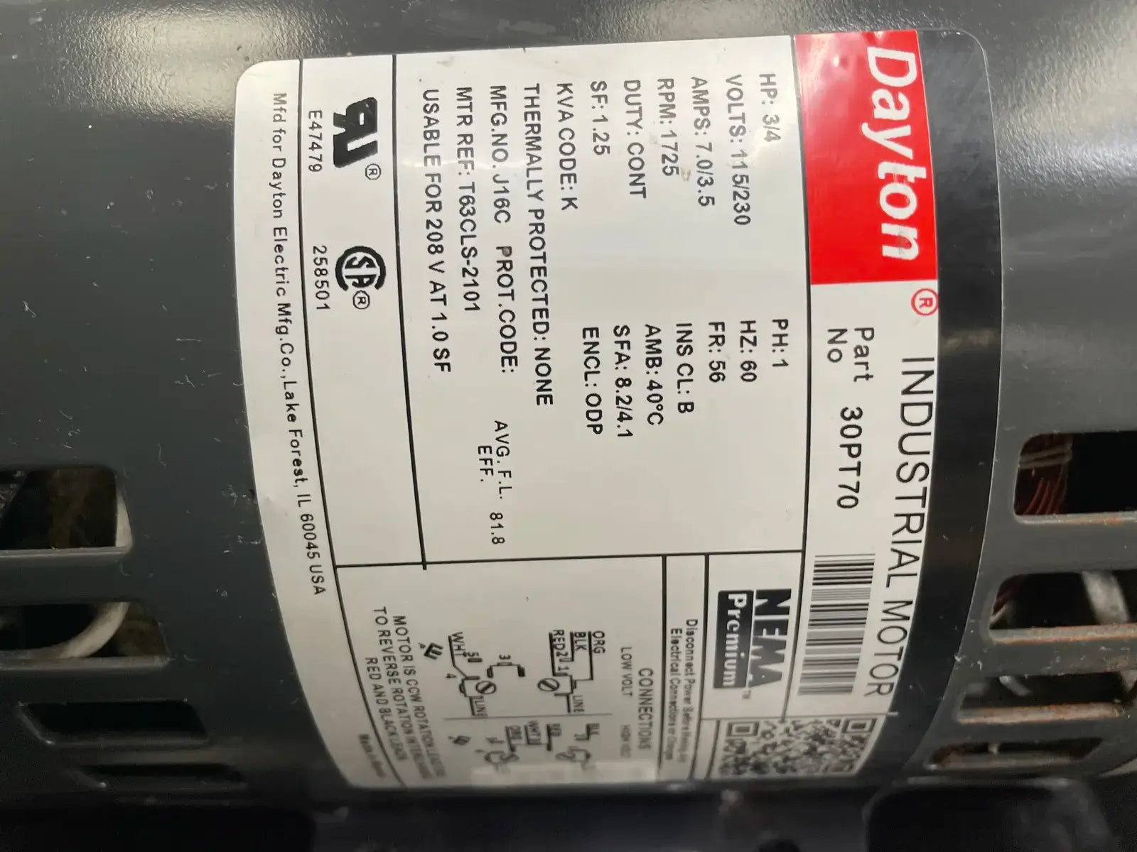 Unused Dayton 30PT70 Single Phase Industrial Motor. Part No: 30PT70. Power Supply: HP: 3/4, Volts: 115/230, Amps: 7.0/3.5, RPM: 1725, Ph: 1, Hz: 60, Frame: 56.