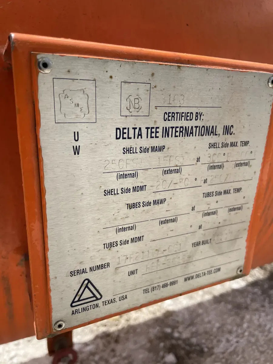 Delta Tee International HPR-301C-P Horizontal Ammonia Receiver (30in x 139in. 487 Gallons) Serial Number: 17F2118A-CC1. Tank National Board Number: 3163. Tank Estimated Capacity (Gallons): 487. Tank MAWP (PSI at Temp): 250 PSI @ 300 F. Tank MAWT (PSI @ Temp): -20 @ 250 PSIG. Previous Refrigerant was Ammonia (R717 | NH3). Manufactured in 2017. Shipping Dimensions (Inches): 139 x 30 x 65. 1500 LB