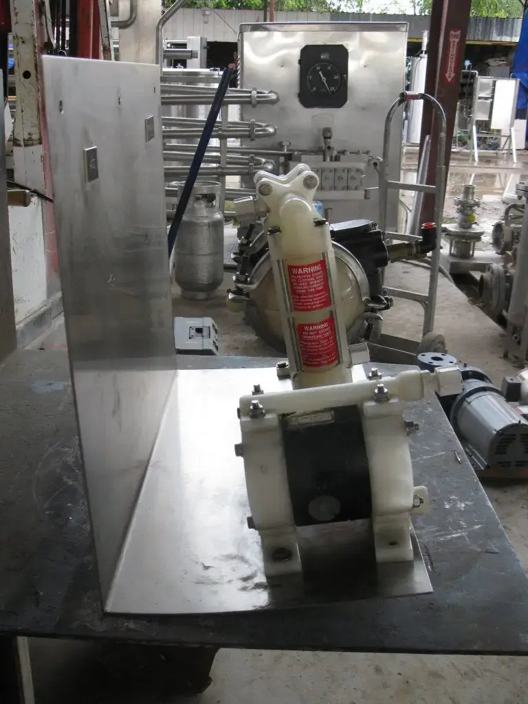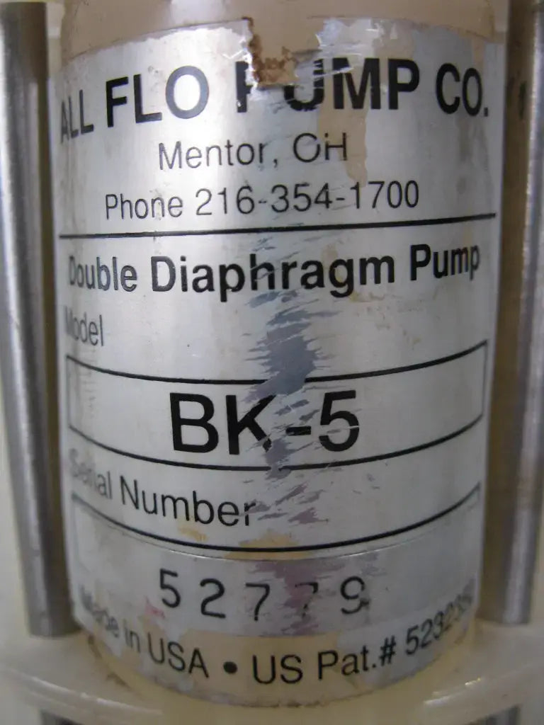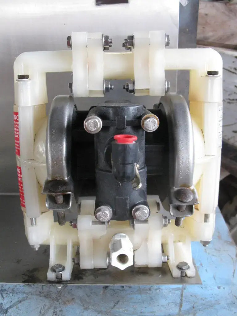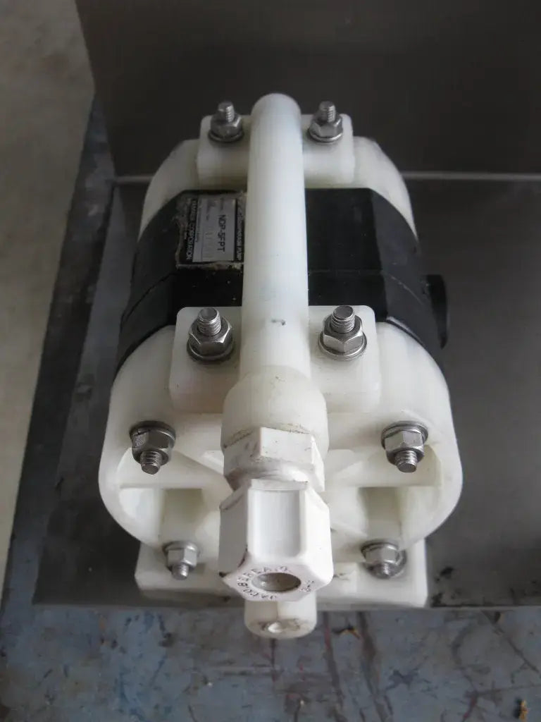 Yamada Diaphragm Pump. Model: NDP-5FPT. S/N: 018517. Max. air pressure:0.5 MPa. Inlets/outlets: (2) 1⁄2 in. FNPT, (1) 3⁄4 in. FNPT, (1) 3/8 in. FNPT. Overall Yamada pump dimensions: 6-1/4 in. L x 4-3/8 in. W x 5-3/4 in. H.