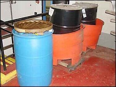 (3) Drums. Oil and Lube. w/ spill tubs.