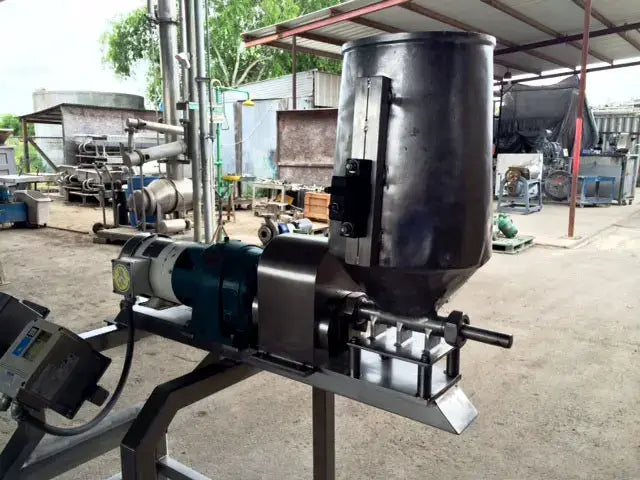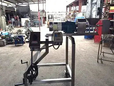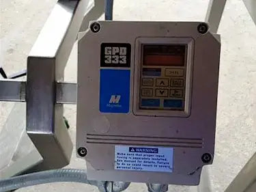 Dry Ingredients Precision Screw Feeder, Leeson Washguard Motor, ½ hp, 1725 rpms, 208-230V, 3 phase, Dodge gear reducer with 17.1 gear ratio, final rpms: 100. Unit is speed controlled using Magnetek GPD333 VFD. Oval outlet dimensions: ¾ inches long x 3/8 inches wide. Overall dimensions: 72 in. x 36 in. x 70 in. High.