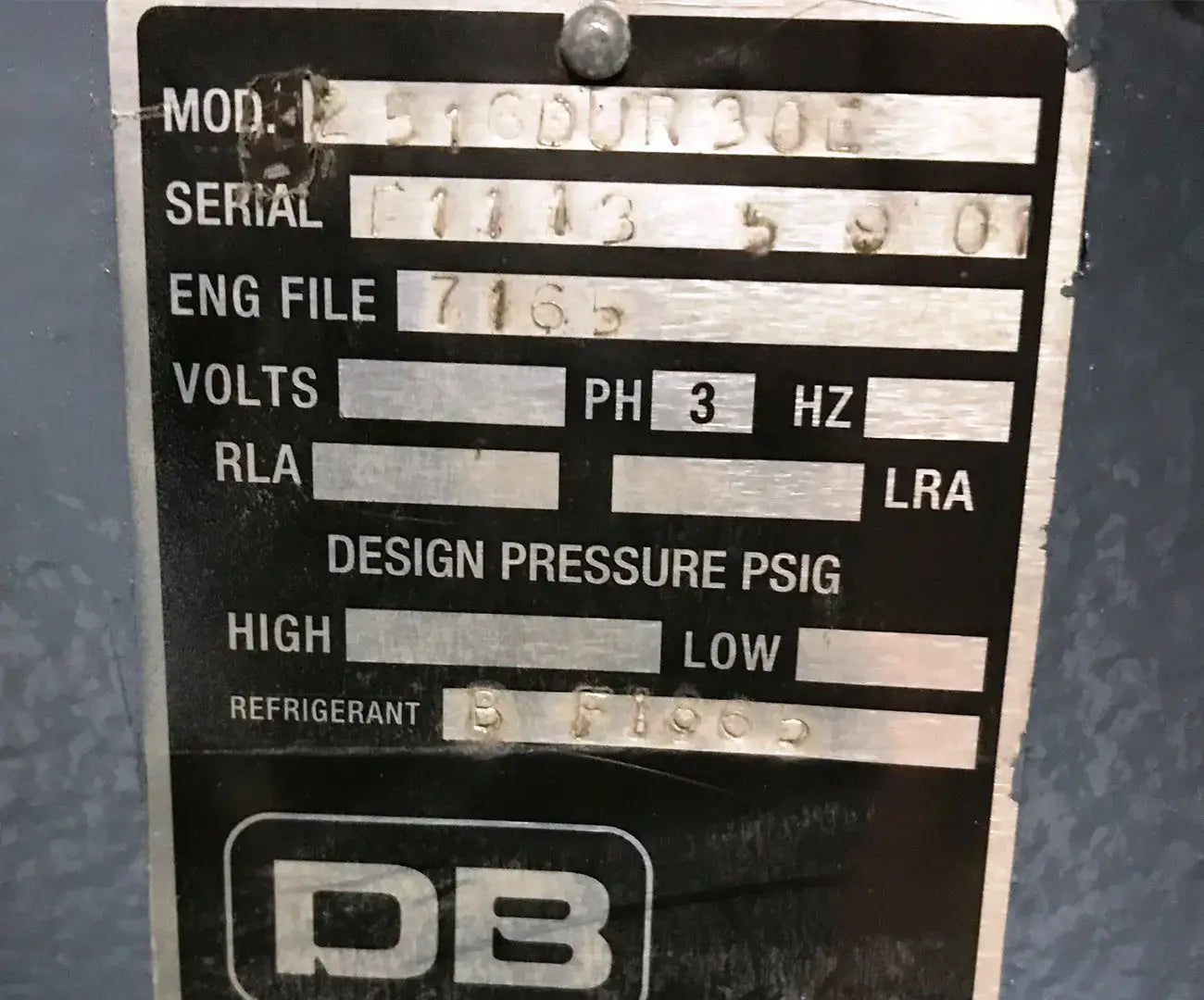 Dunham-Bush Rotary Screw Compressor. Model: 2516DUR30E. Serial F1113 5 9 01. Eng File 7165. 3-phase. Refrigerant: F1865. Previous owner said it was refurbished but never run.