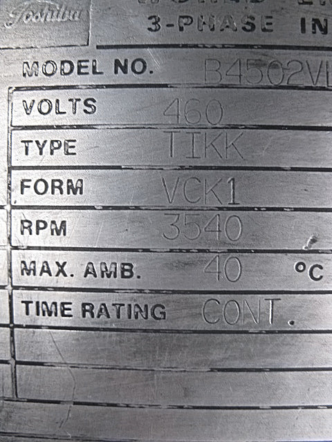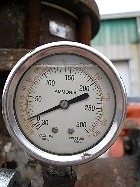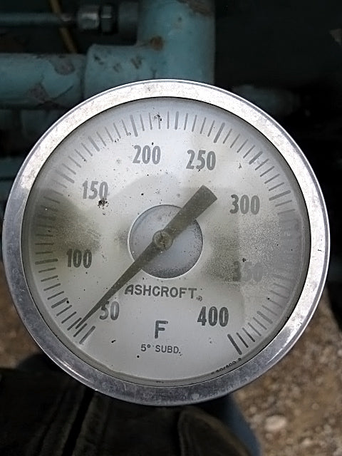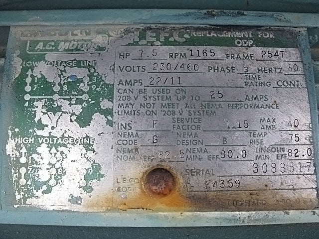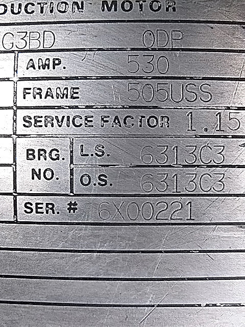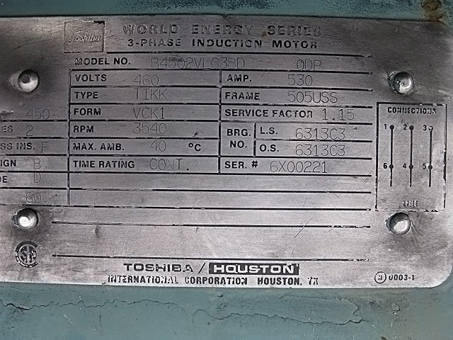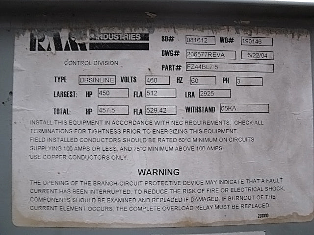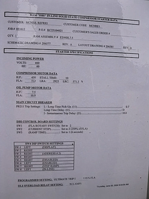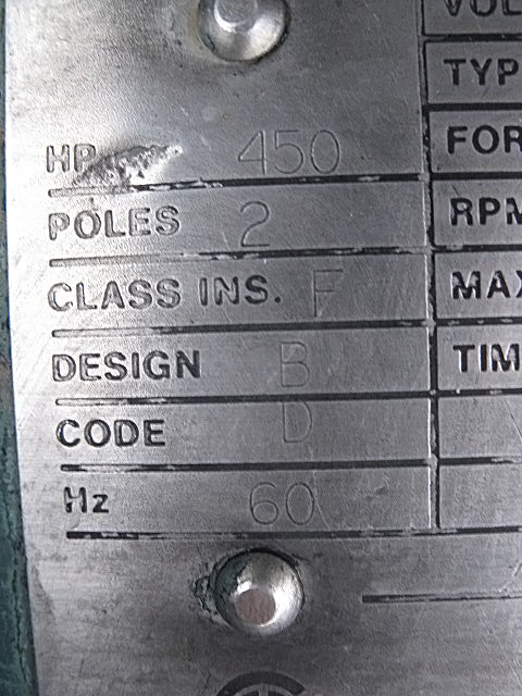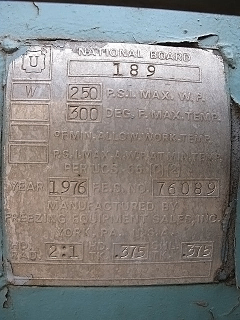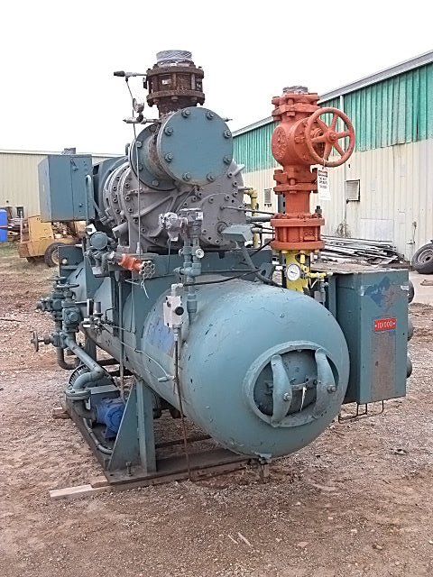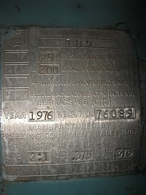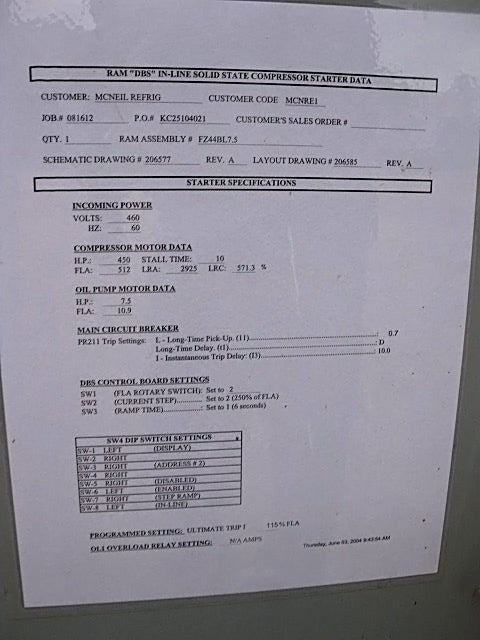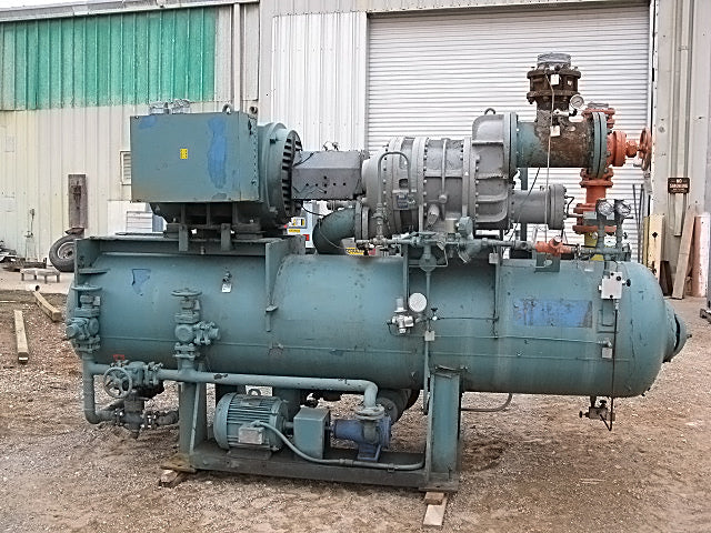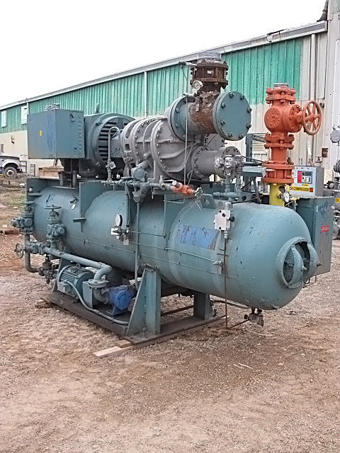 FES / Dunham Bush Screw Ammonia Compressor Package. Model: 350. Approximate capacity rating: 400 tons at 33.5 PSIG suction (20°F) and 181 PSIG discharge (95°F) using ammonia (R-717) with liquid subcooling at 10°F. Dunham Bush compressor: model 2510 / FES no. 350, x-no. 5065. Leak test pressure 313 psig, Hyd. test pressure 470. Displacement: 1061 cfm. Toshiba compressor motor model: B4502VLG3BD ODP, 450 HP, 3540 rpm, 460V, 530 operating amps, 60 Hz, 3 phase. This motor was serviced in 2008 with bearings and leads replaced and rotor balanced. Lincoln oil pump motor: 7-1/2 HP, 1165 rpm, 230/460V, 22/11 amps, 60 Hz, 3 phase. Contract # 76-151-61- (42). FMS 350, 76-151-61. Oil separator: FES no: 76089, National Bd. No: 189. MAWP: 250 PSI at 300°F. Hours on compressor: 37569. . Compressor overall dimensions: 11 ft. 10 in. L x 5 ft. W x 7 ft. 7 in. H.(H4).