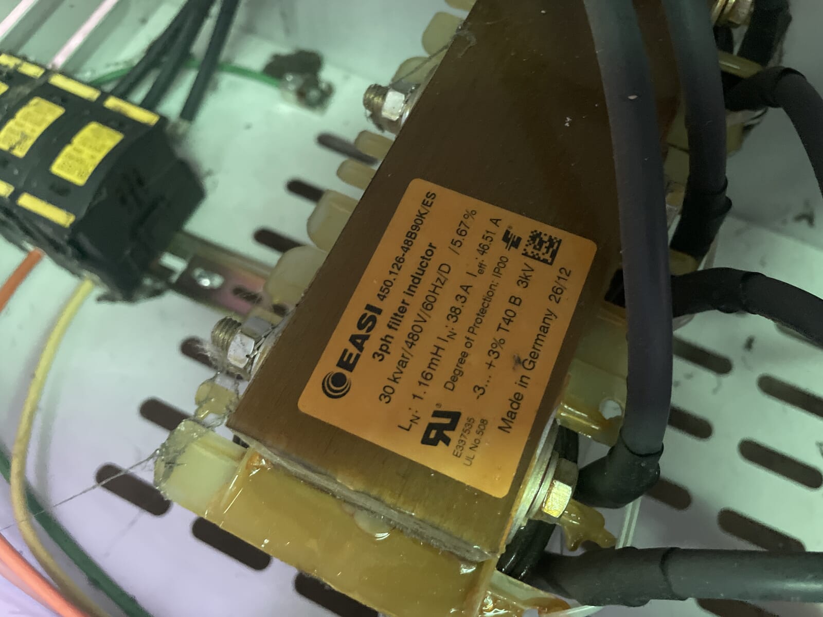 PowerLiner Reactive & Distortion Power Correction System. Model: PWL-4000H w/ fusing. Manufactured 1/28/2014. Voltage: 440-480 Amps: 36 KVAR: Phase: 3 Frequency: 60Hz. 38.3/46.51 Amps.