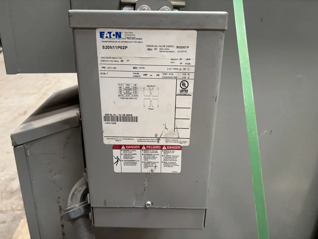Eaton General Purpose Encapsulated Transformer. Type: S20N11P02P. Serial No: J16G11658. Enclosure: NEMA 3R. Frame: 68P. Frequency Rating: 60 Hz. Phase: Single Phase. Primary Voltage: 240/480 Volts. Secondary Voltage: 120/240 Volts. Volt Amp Rating: 2 KVA.