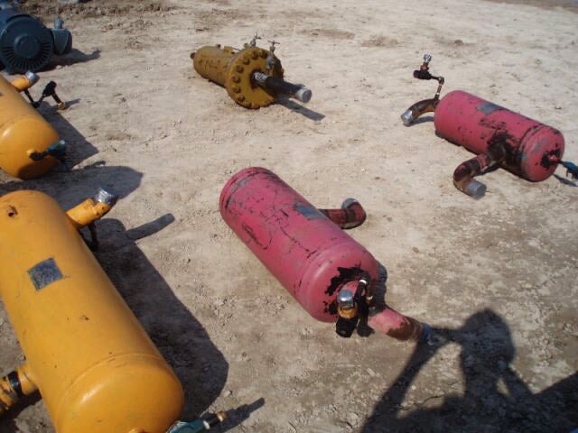 E.L. Nickell Co. Ammonia Surge Drum. S/N: 13120. National Bd. No. 11149. Approximate capacity: 13 gallons. Inside straight wall dimensions: 11-1/2 in dia. x 2 ft. 4 in. L. Refrigerant: R-717. MAWP: 250 PSI @ 650° F. MDMT: - 20° F @ 250 PSI. Inlets/outlets: (2) 3-1/2 in. dia. ports. Overall dimensions: 4 ft. 3 in. L x 2 ft. 11 in. W x 1 ft. 3 in. H.