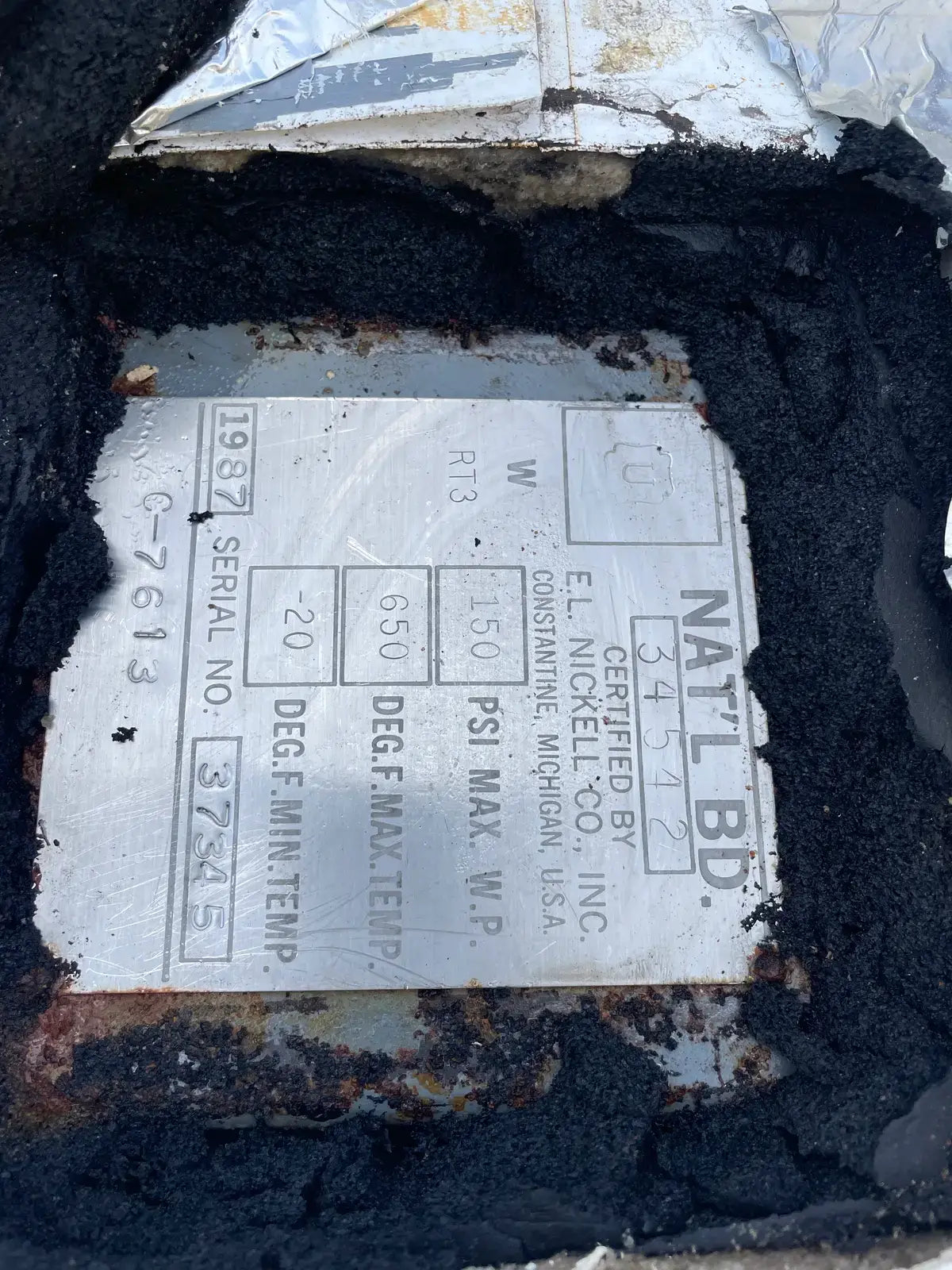 Certified By E.L. Nickell Co, Inc Vertical Ammonia Recirculator. Serial No: 37345. National Board: 34542. MAWP: 150 PSI @ 650 F. MDMT: -20 F @ 150 PSI. Year Built: 1987. Estimated Capacity: 1,050 Gallons. Vessel Dimensions: 42X144.