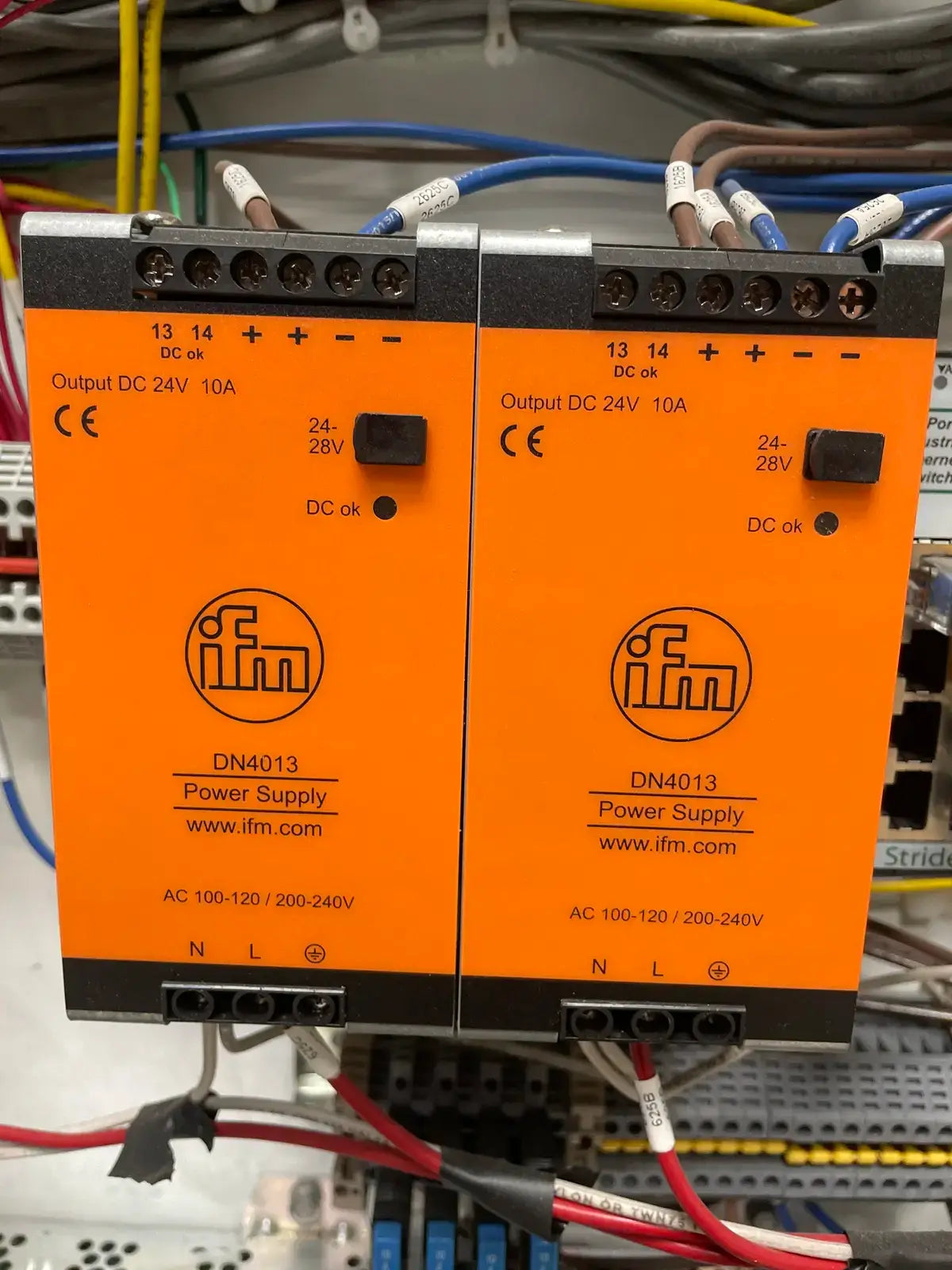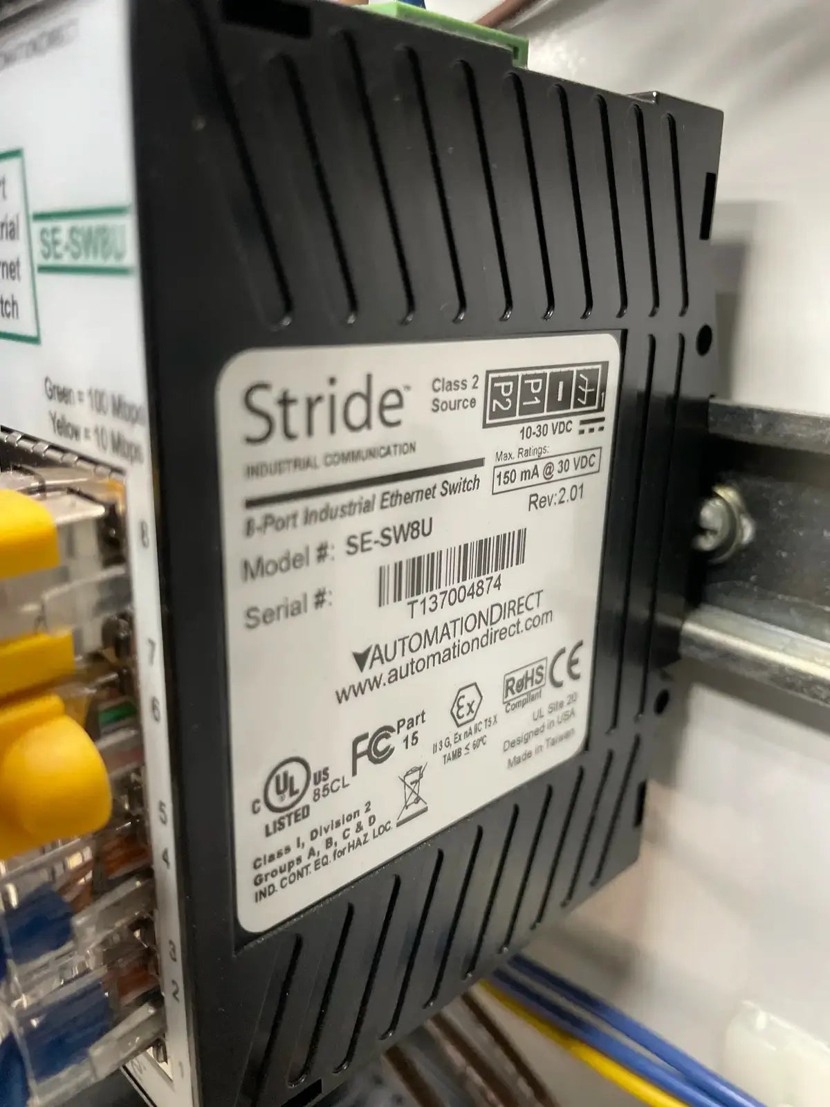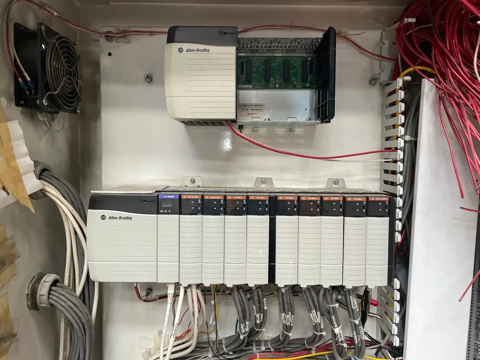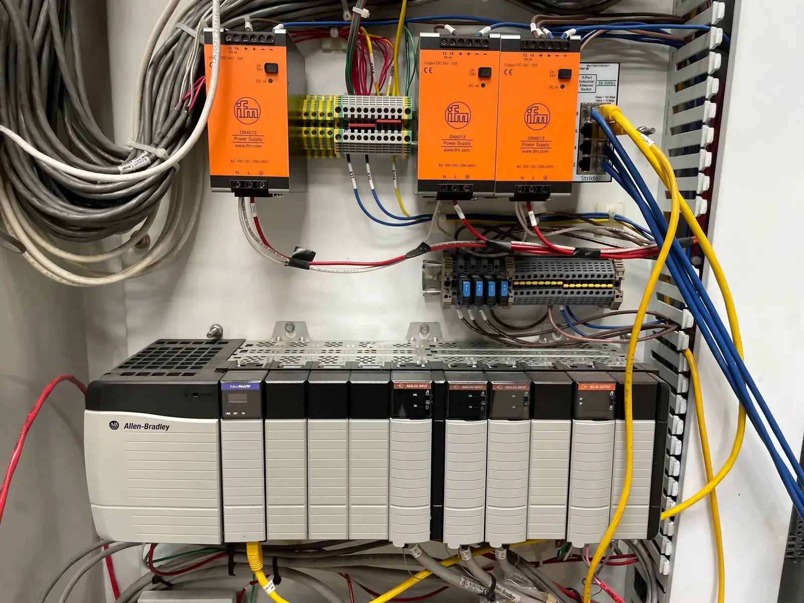 Electric Controls Inc. PLC Control System. Job No: EC 95-2007. Date: 2-21-1996. Power Supply - Volts: 480, Ph: 3, Amps: 60. (3): Allen-Bradley AC Power Supply: Series: B. Model: 1756-PA72/B, Part No: 97060574 E01. (6) Allen-Bradley Analog Input Modules: Cat No: 1756-IF8H. (6) Allen-Bradley Analog RTD Modules: Cat No: 1756-IRT81. (1) Allen-Bradley Isolated Relay Output Module: Cat No: 1756-OQ16I. (3) IFM Switched-Mode Power Supply 24 V DC: Item No: DN4013. (1) Transient Voltage Surge Suppressor: Model HS-P-SP-120-60A-RU, Item No: ZH0S-020. (1) Stride Industrial Unmanaged Ethernet Switch: Model: SE-SW8U. (6) EATON WMZT Rail Miniature Circuit Breakers: Cat No: WMZT1C06.