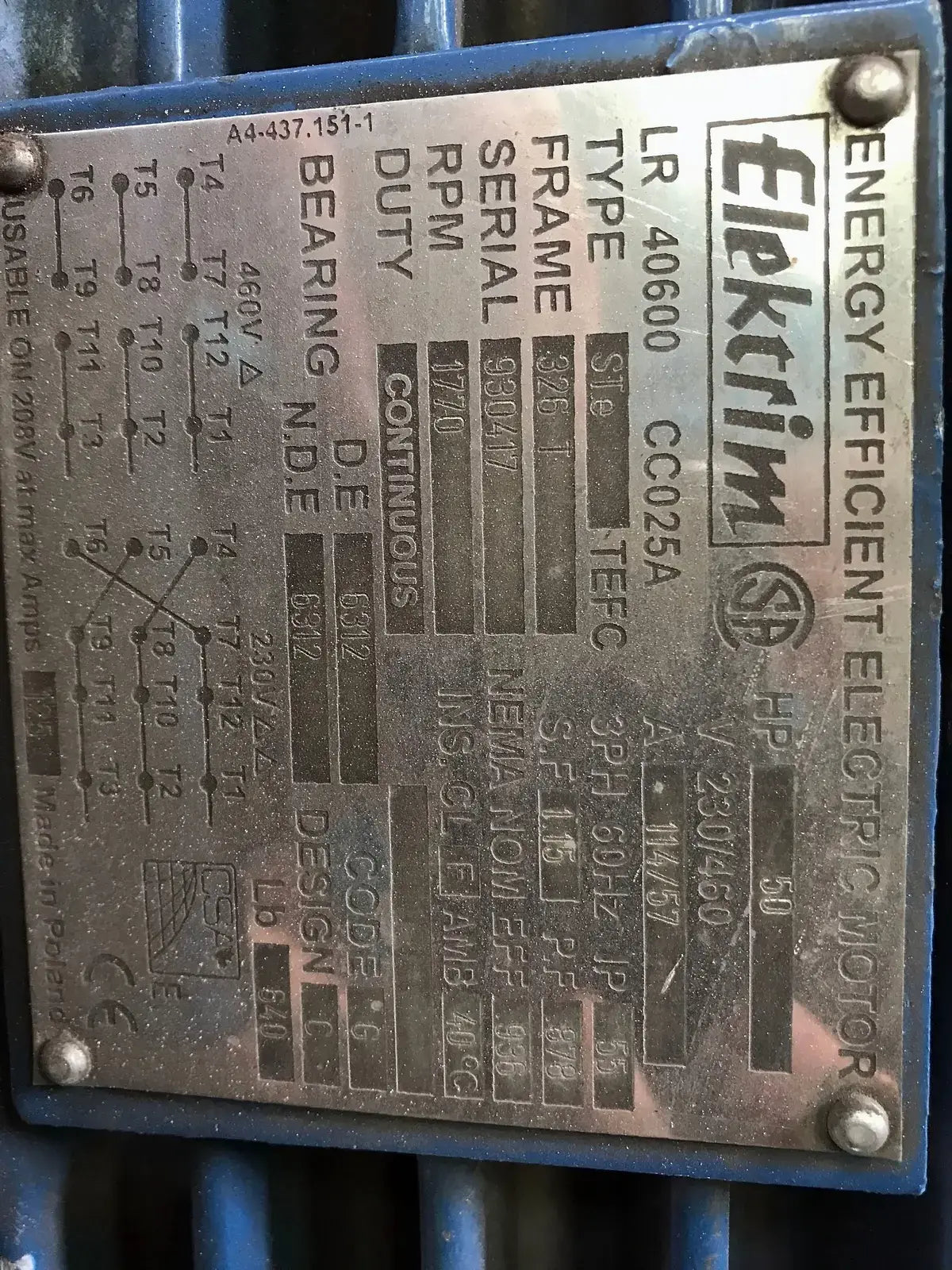 Elektrim Energy Efficient Electric Motor - 50 HP, 1770 RPM, 208-230/460V, 125-114/57 amps, 3-phase, 60 Hz, 326T Frame. Made in Poland.