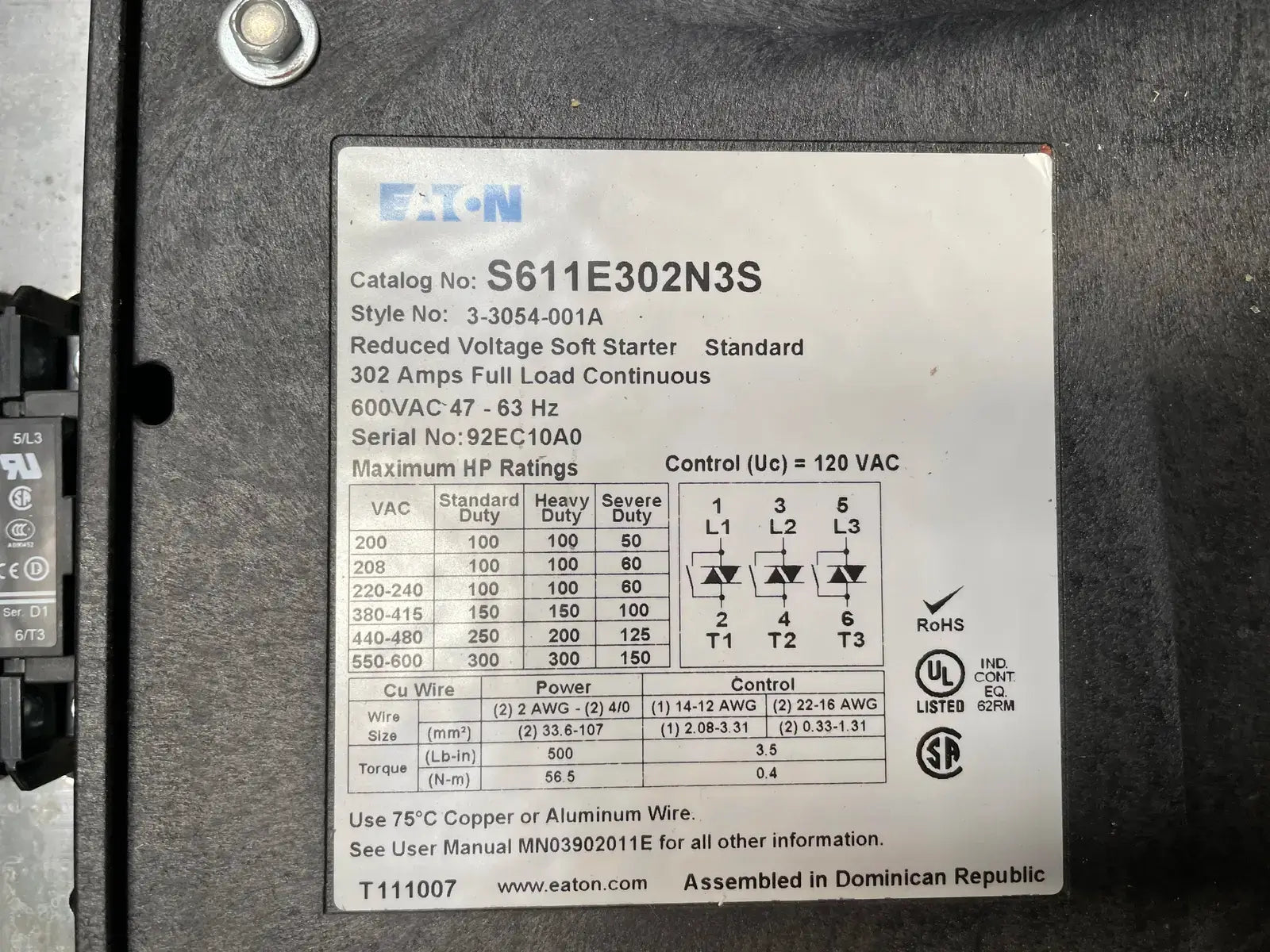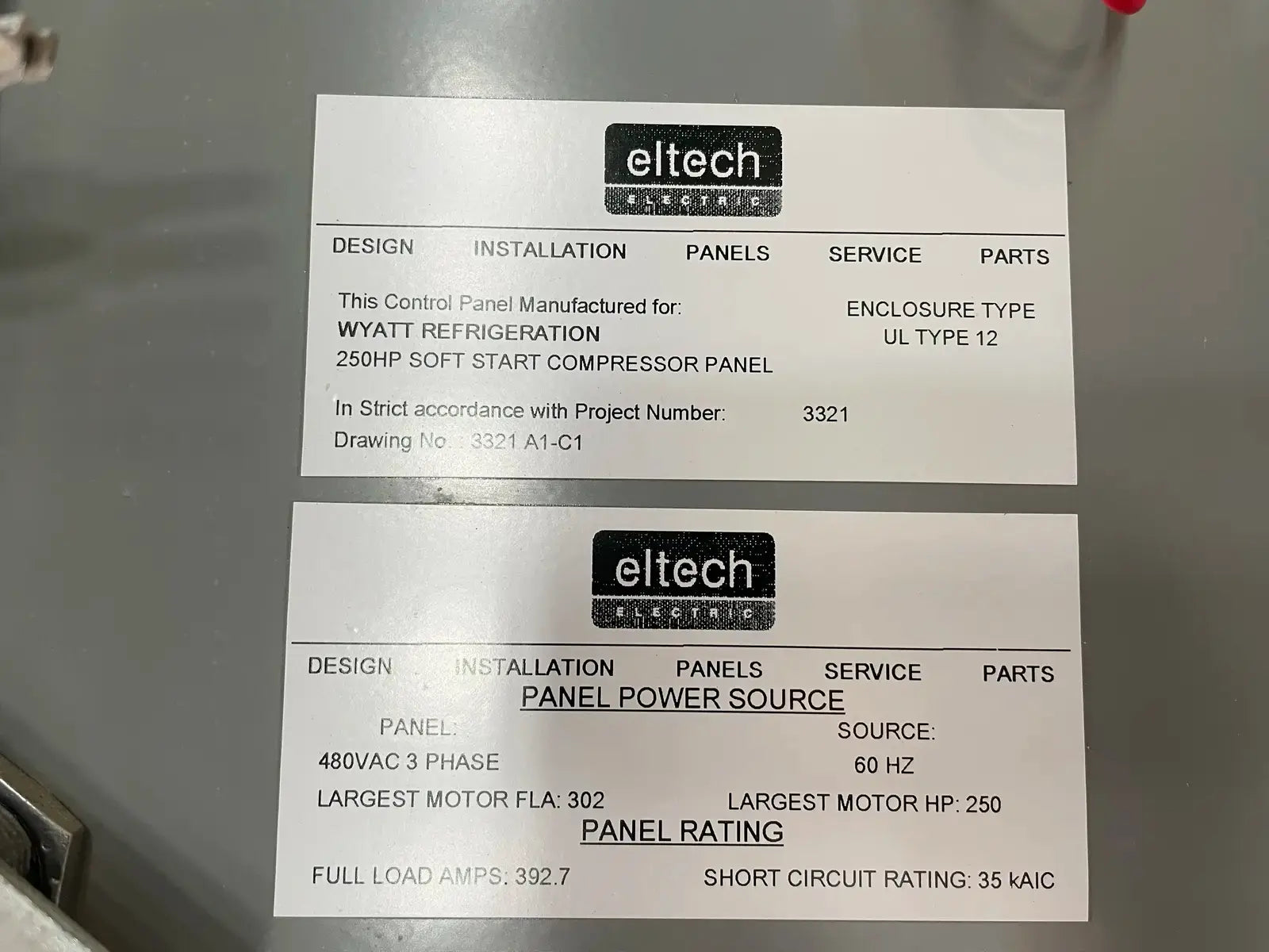 Eltech Electric Ice Maker Motor Starter. Project No: 3321. Drawing No: 3321 A1-C1. Power Supply: Volts: 480, Ph: 3, Hz: 60, HP: 50, FLA: 392.7. Max HP Motor: 250 HP. Max Motor FLA: 302. Short Circuit Rating: 35kAIC.