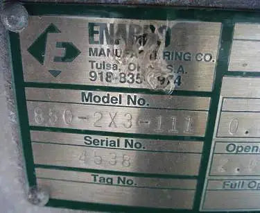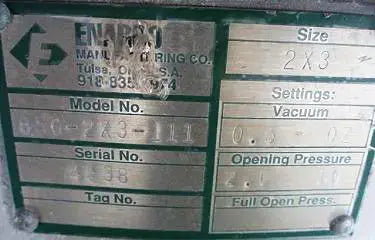 Enardo Pneumatic Valve. Model: 850-2X3-111. S/N: 4538. Size: 2X3. Vacuum settings: 0.5 oz. Opening pressure: 2.0 in. Inlet: (1) 2 in. dia. flanged port. Outlet: (1) 3 in. dia. flanged port. Overall dimensions: 1ft 3 in. L x 9-1/2 in. W x 17 in. H.