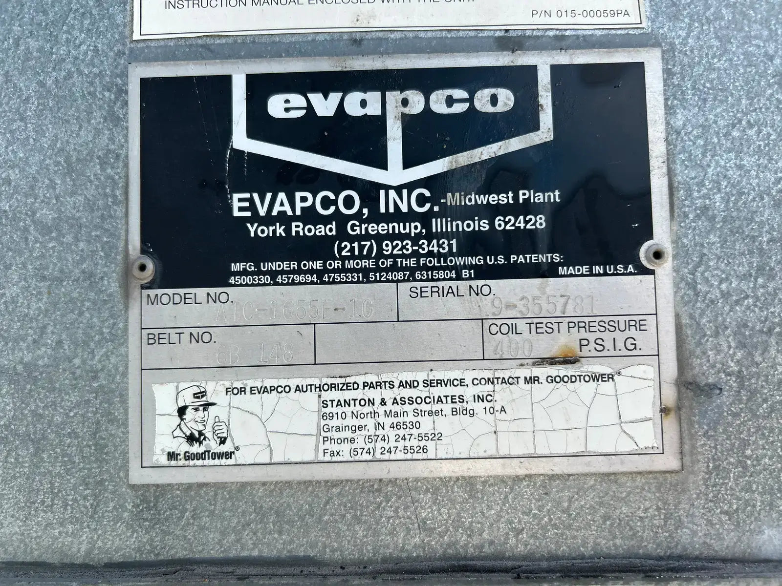 Evapco ATC-1655E-1G Evaporative Condenser (827.5 Nominal Tons, 2 Motors, 1 Tower Unit) Serial Number: 90355781 This package contains 1 Tower Unit. 827.5 Nominal Tons. 587 Ammonia Tons. Previously Ran with Ammonia (R-717).2- Motors are included.