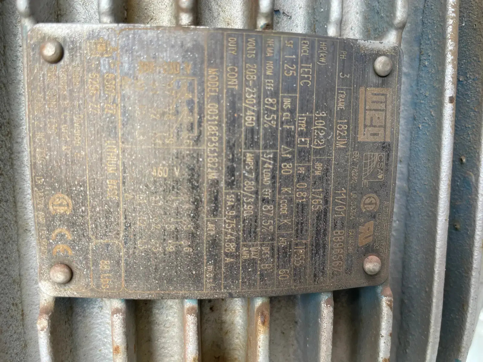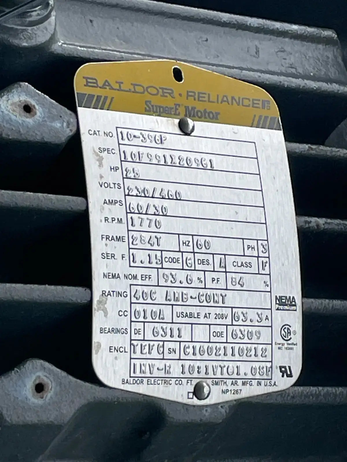 - If Multiple Motors, Motor Descriptions vs specs: (1) Standard Fan Motor. Baldor Reliance. Super E-Motor. Serial No. C1602110212. (1) Pump motor. WEG Pump Motor. Model No. 00318EP3E182IM.