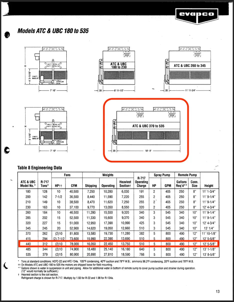 Evapco ATC-440P Evaporative Condenser ( 440 Nominal Tons, (1) 5 HP Spray Pump Motor, (2) Fan Motors1 Tower Unit)
