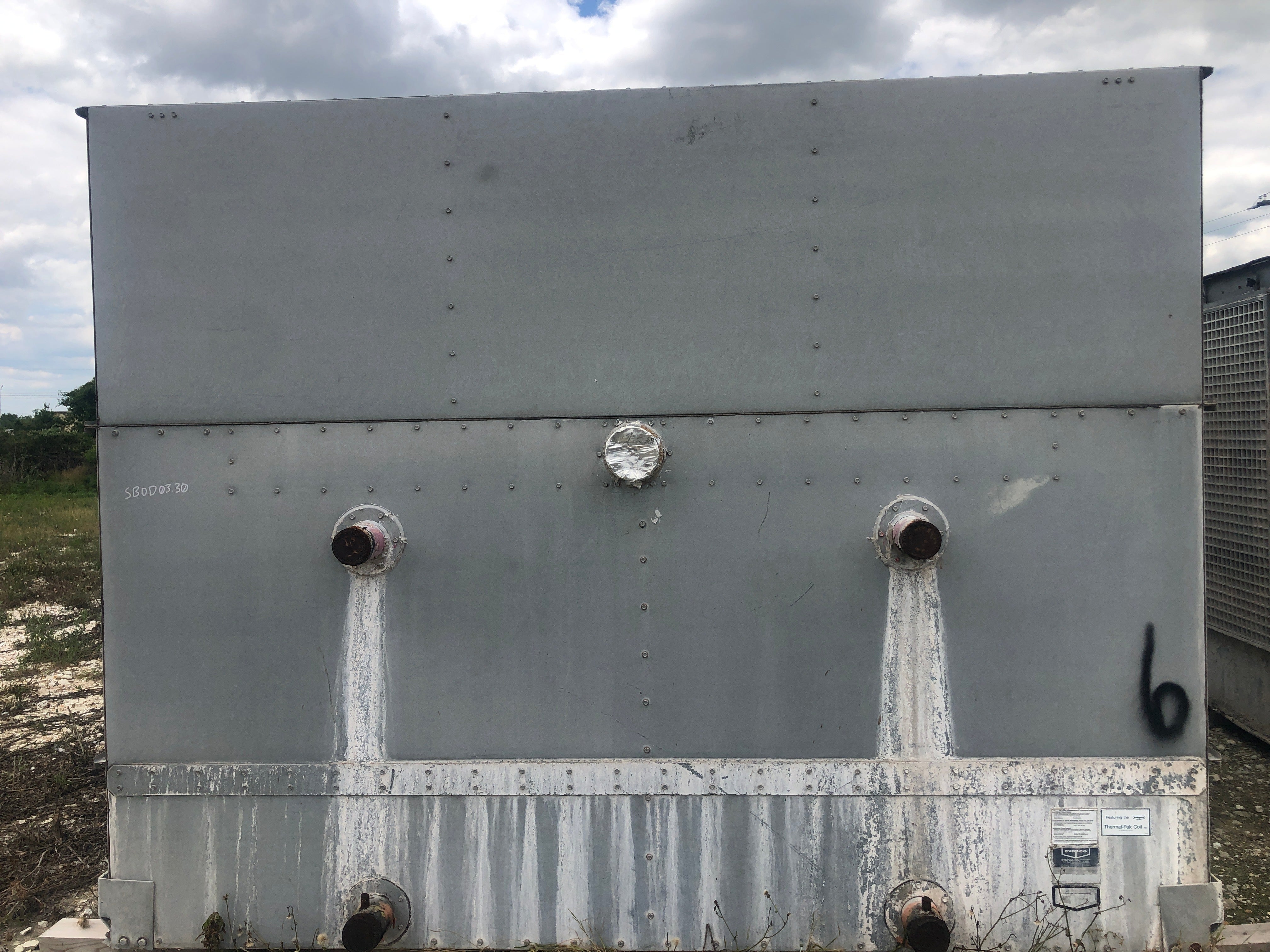 Year of Manufacture: 2003 Number Units in Package: 1 Nominal Tons (total): 967 TR* Ammonia Tons (total): 686.57 TR*Coil Volume (total): 134 ft3 CFM (total): 155300 CFM R-717 (ammonia) or R22 (freon). Last run with Ammonia. Design pressure: 400 PSIG Pump Requirements (per unit): 10 HP 1,400 GPM Pump Included? Sump Pump : Peerless Pump Model # 1260GMBF40 S/N 052003 9.78 trim Capacity 1400 gpm @ 80ft. Pump speed 1770 Pump Motor: Baldor Ind. Cat # JMM4110T 40HP 460 volt 1770 RPM 324JM Frame Pump pressure: 3 psig @ the condenser Fan Details (per unit): 60 HP 460 volt 60 Hz 1785 rpm Frame: 364T 160/80 FLA Belt: 6B-148 Top Dimensions (per unit): 22'4 L x 11'10 W x 10'5 H Top Weight (per unit): 29,850 LBS Bottom Dimensions (per unit): 22'4 L x 11'10 W x 6'3 H Bottom Weight (per unit): 4,300 LBS Other Notes about machine: After Seaboard Foods built their new engine room, we purchased their entire original engine room in Oklahoma, USA. *Tons at standard conditions: 96.3°F condensing, 20°F suction and 78°F Wet Bulb Can sell one tower unit from a group upon request for a fee. Please request as needed.