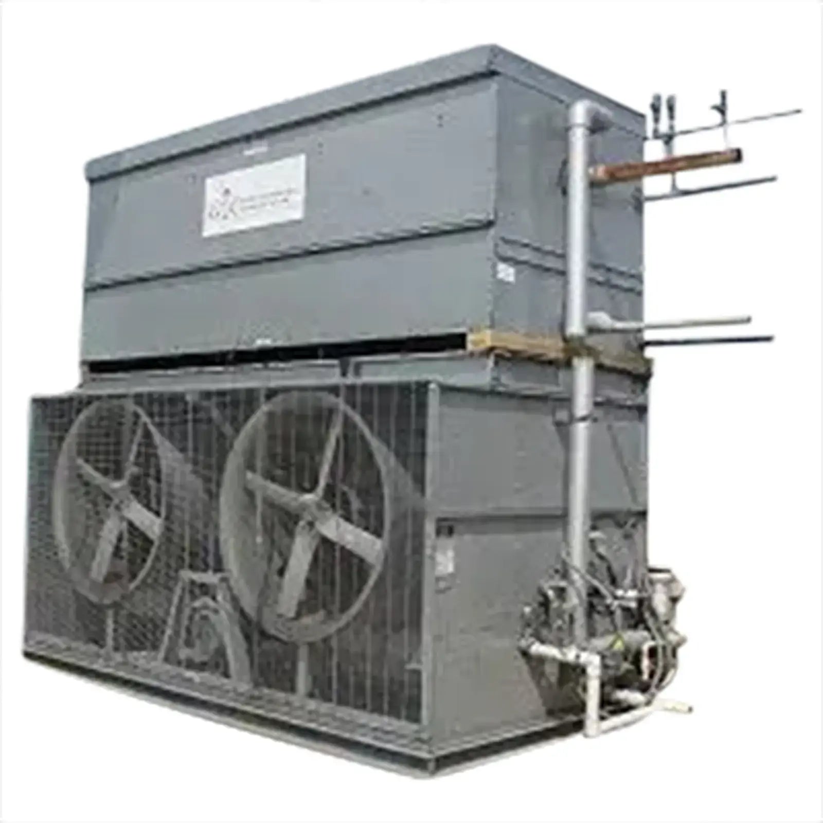 2006 Evapco Evaporative Condenser. Model: PMCB-190. Rated capacity: 190 tons using R-22 at 105ºF condensing, 40ºF suction and 78ºF web bulb temperatures or 137 tons using R-717 at 96.3ºF condensing, 20ºF suction and 78ºF wet bulb temperatures. Coil test pressure: 350 P.S.I.G. (1) Centrifugal pump with 5-1/4 in. dia. impeller and U.S. motor: 2 hp, 1725 rpm, 208-230/460 V, 6.20-6.00/3.00 A, 60 Hz, 3 phase. (1) Reliance Electric motor: 10 hp, 1750 rpm, 230/460 V, 24.4/12.2 A, 60 Hz, 3 phase. Pulley info: (1) 6 in. driver, (2) 1 ft. 1 in. driven. (2) 3 ft. 8 in. dia. fan. Inlets/outlets: (1) 2 in. pipe port, (1) 1 in. pipe port, (1) 1-1/2 in. MNPT, (1) ¾ in. pipe port, (1) 3/8 in. air valve, (1) ¾ in. FNPT, (1) 3-1/2 in. pipe port, (2) 2 in. pipe ports, (1) 4 in. pipe port. Overall dimensions: 16 ft. L x 7 ft. 2 in. W x 12 ft. 2-1/2 in. H.