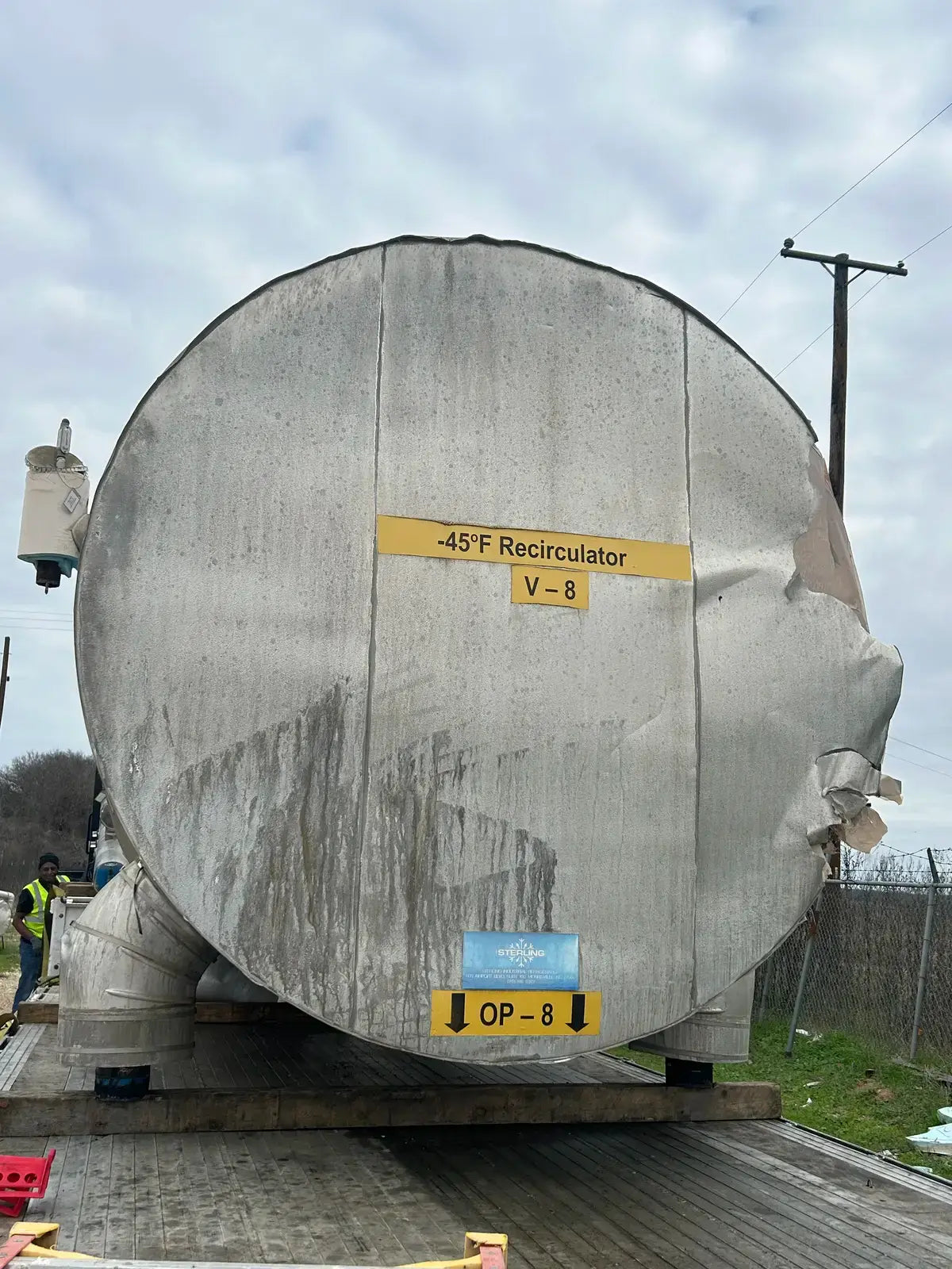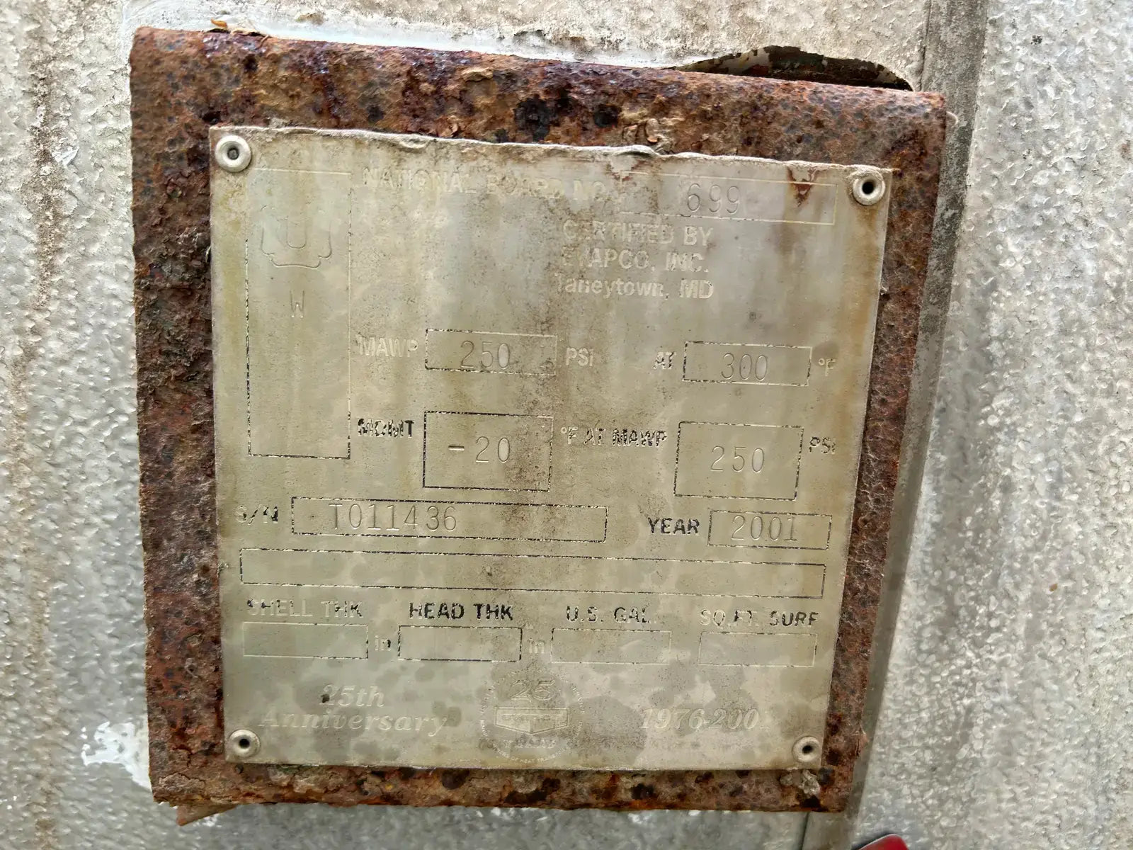 Certified by Evapco Inc. Horizontal Ammonia Recirculator. National Board: 699. Serial No: T011436. Drawing No: T011436. MAWP: 250 PSI @ 300 F. MDMT: -20 F @ 250 PSI. Vessel Dimensions: 72 in.O.D X 119"L. Estimated Gallon Capacity: 2930 Gal. Year Built: 2001.