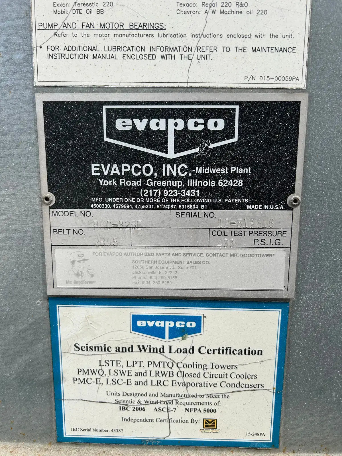 Evapco Single Tower Ammonia Evaporative Condenser. Model No: PMC-325E. Serial No: 12-518616. Belt No: 2B95. Coil Test Pressure: 400 PSIG. CFM: 50900. R-717 Capacity: 230 TR. Nominal Tons: 325 TR.