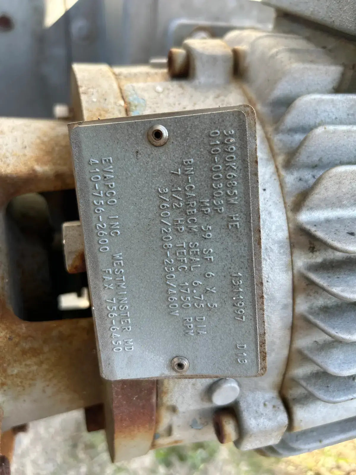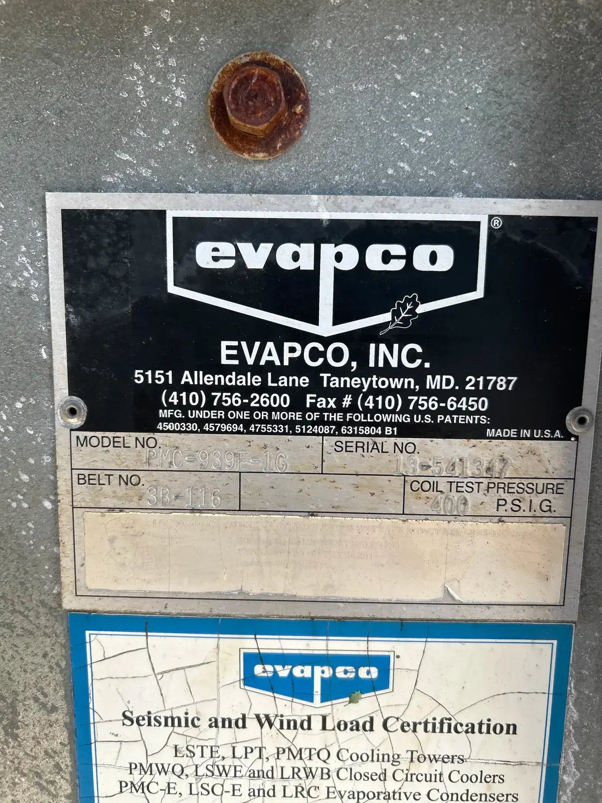 Evapco PMC-E 1-Tower Evaporative Condenser. Model: PMC-939E-1G. Serial No: 13-541347. Belt No: 3B-116. Coil Test Pressure: 400 PSIG. Nominal Tons: 939. Ammonia Tons (R-717): 666. Refrigerant Charge (LBS): 885. Coil Volume ft3:121. Spray Pump: 7.5 HP, 1200 GPM.