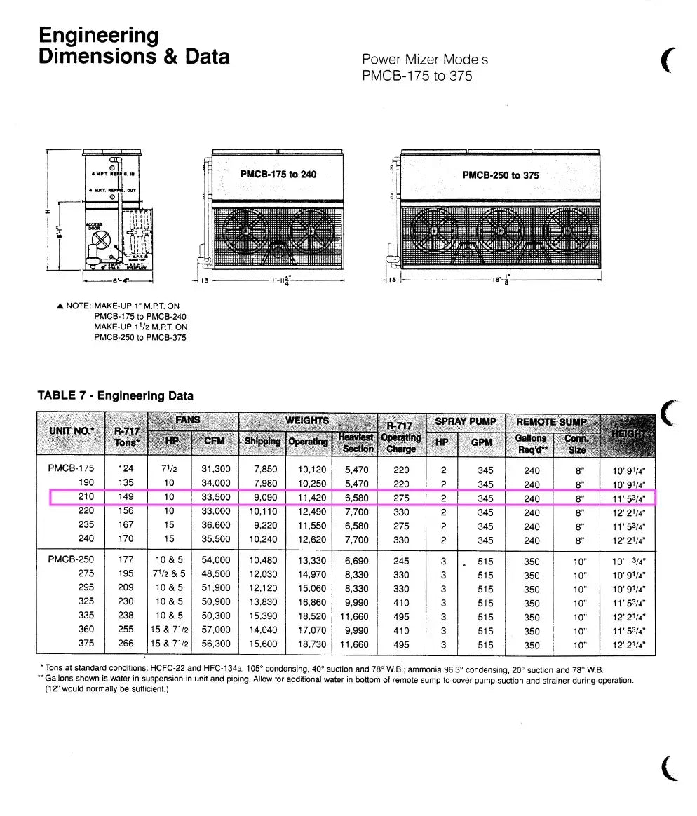 Evapco Single Tower Evaporative Condenser. Model No: PMCB-210. Serial No: 4-108305. Belt No: 2B-95. Coil Test Pressure: 400 PSIG. Nominal Tons: 210. Ammonia Tons (R-717): 149. CFM: 33,500. R-717 Operating Charge: 275.