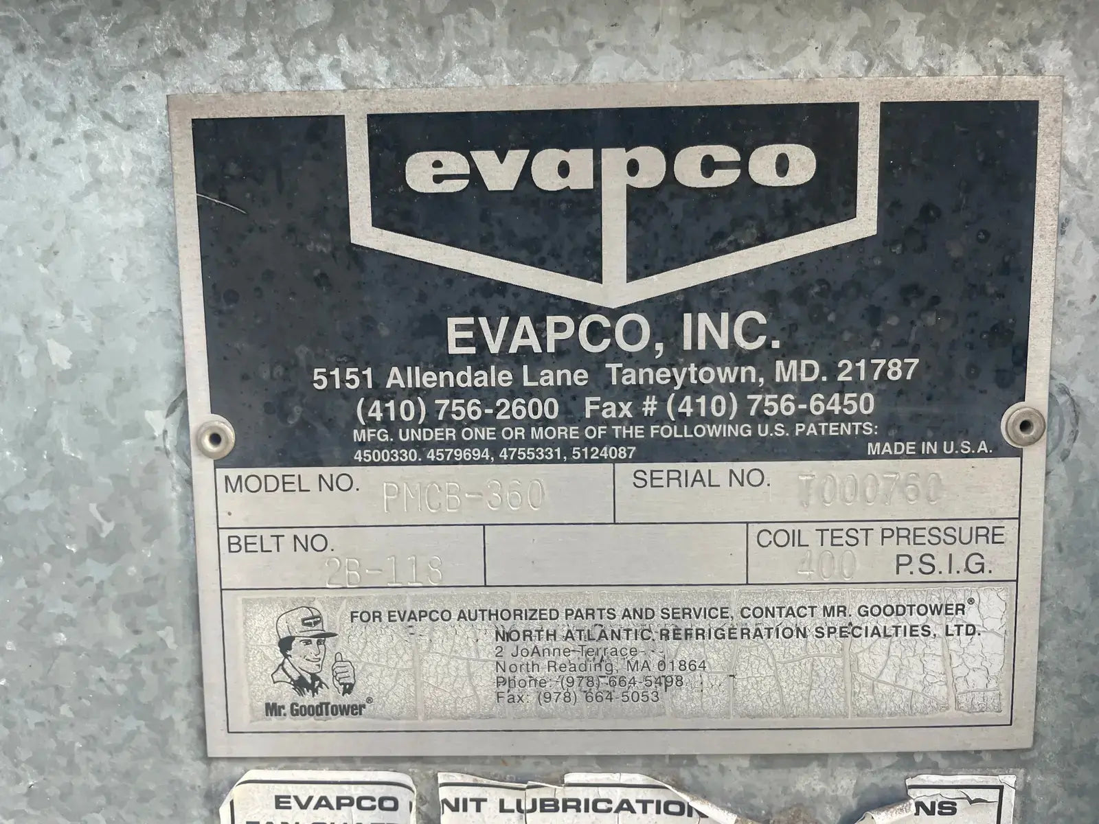 Evapco Ammonia Evaporative Condenser. Model: PMCB-360. Serial Number: T000760. This package contains a 1 Tower Unit. 360 Nominal Tons. 255 Ammonia Tons. Previously Ran with Ammonia (R-717).