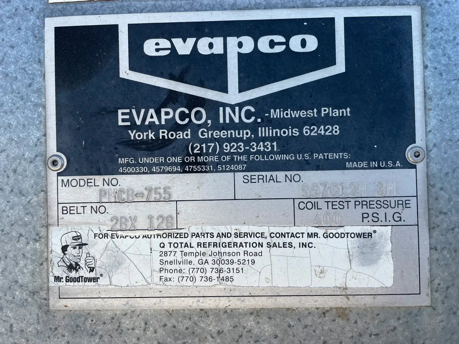 Evapco PMCB Evaporative Condenser. Model: PMCB-755, Serial No: 997012M 3M. Belt No: 2BX 128. Coil Test Pressure: 400 PSIG. This package contains 1 Tower Unit. 755 Nominal Tons. 535 Ammonia Tons. Previously Ran with Ammonia (R-717). 3 Motors are included.