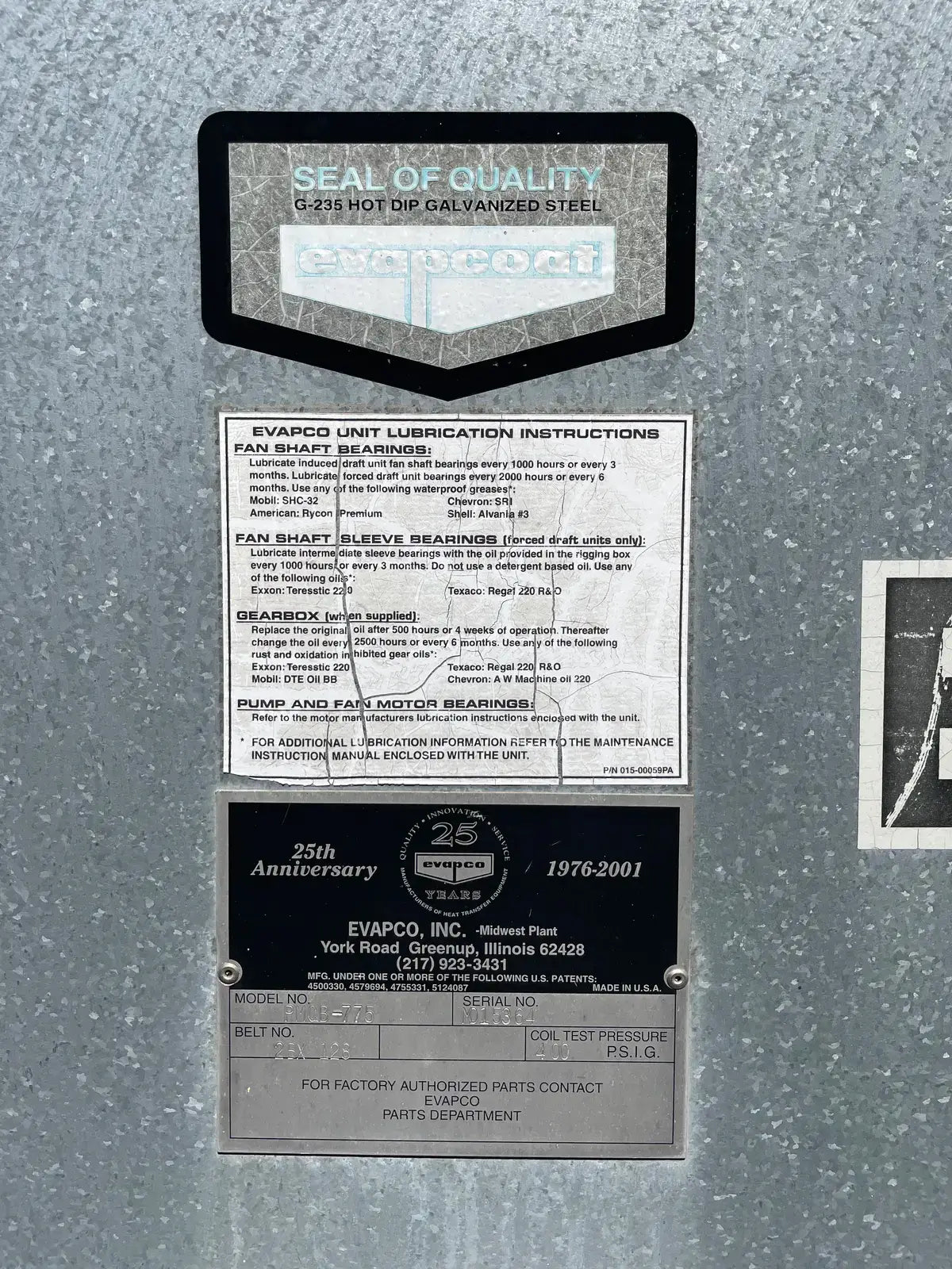 Evapco PMCB775 Evaporative Condenser (775 Nominal Tons, 2-20 HP Motors, 1 Tower Unit). Serial Number: M015364 This package contains 1 Tower Unit. 775 Nominal Tons. 450 Ammonia Tons. Previously Ran with Ammonia (R717 | NH3). 2-20 HP Motors are included.