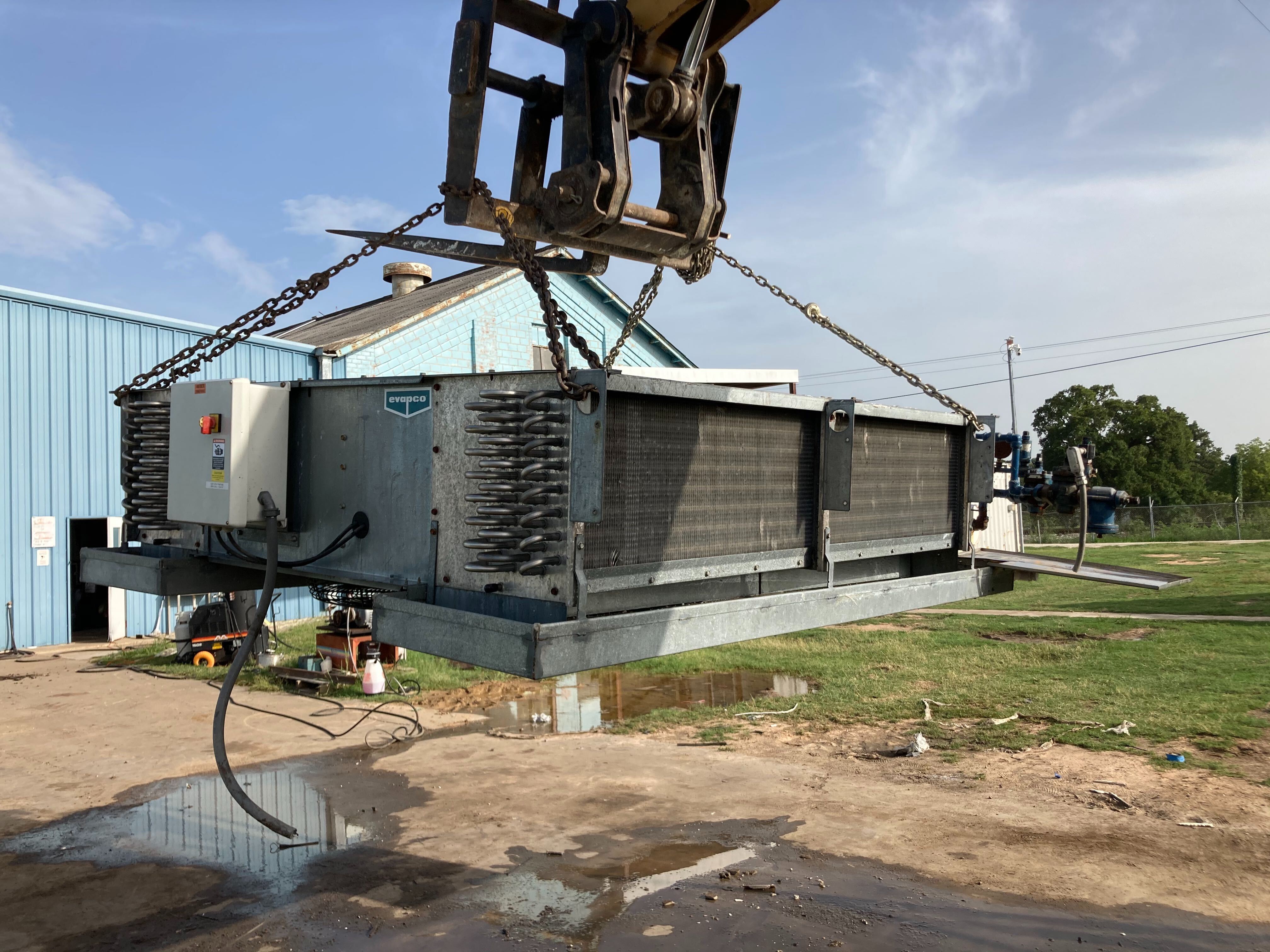 Evapco SSTD2-00700-3 Ammonia Evaporator Coil - 9.63 TR, 2 Fans (Low/Medium Temperature) This unit can be run with either Low or Medium temperature coils . A wet capacity of 7704 (BTUH / °F TD) and an estimated tonnage of 9.63 (TR) @15TD. A frosted capacity of 7003 (BTUH / °F TD) and an estimated tonnage of 9 (TR) @15TD. An air flow of 11400 CFM and a face velocity of 611 FPM. A coil volume of 1.4. Recirculated bottom fed coils with a electric defrost system. The precious refrigerant was Ammonia, but it can be ran with Freon.