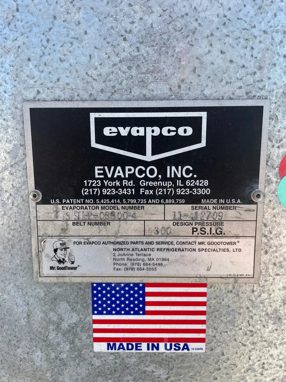 Evapco Low-Temperature Evaporator Coil. Evaporator Model: SSTL2-03300-4. Serial No: 11-412709. Design Pressure: 300 PSIG. Stainless Coils. Fins Per Inch: 4.