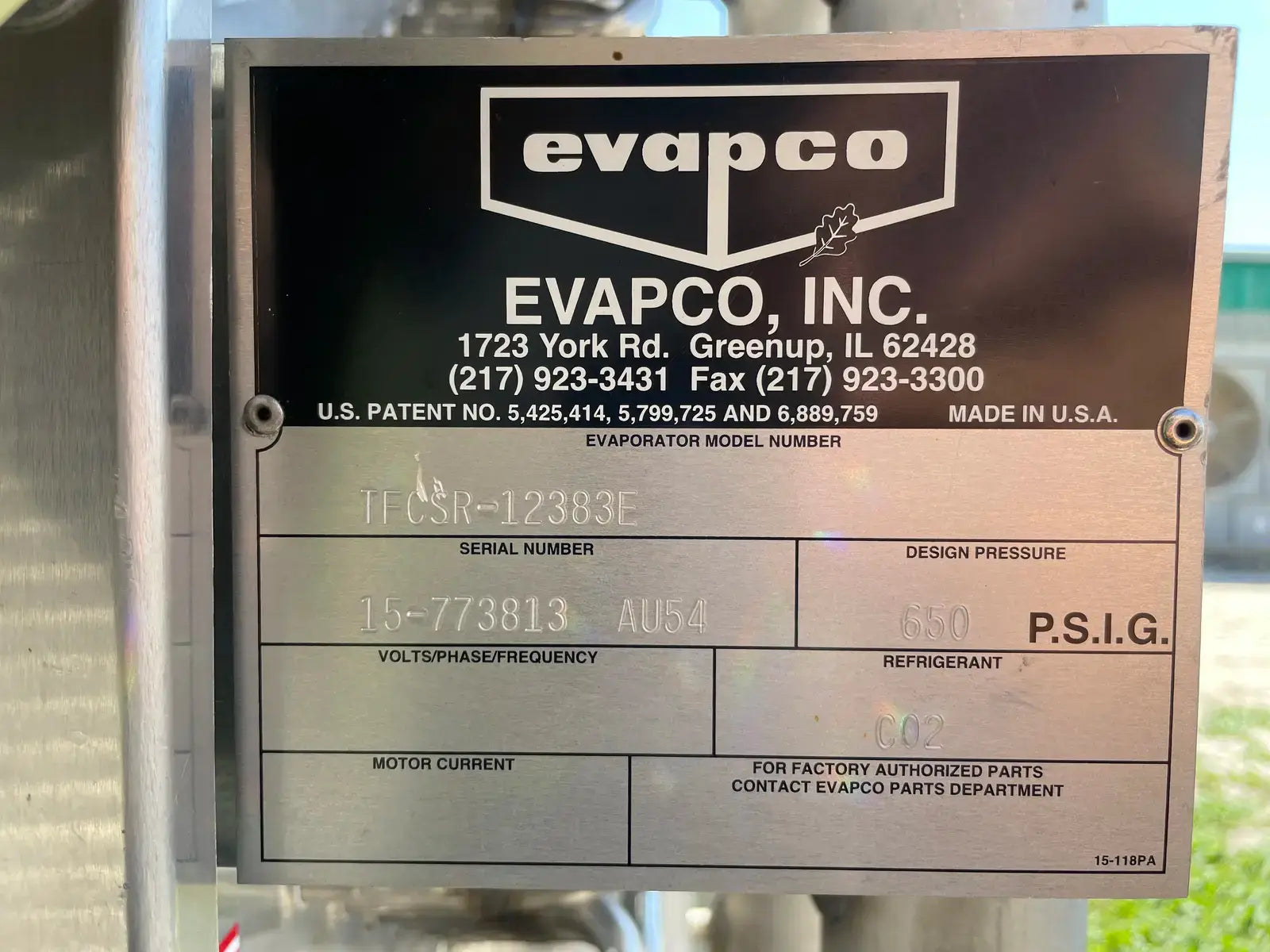 Evapco TFCSR Series Low Temperature Blast Freezer. Model: TFCSR-12383E. Serial No: 15-773813. Tonnage: 65 TR. Base Rating: 10˚F. Previous Refrigerant: R-744. CFM: 107479. Fins Per Inch: 3. Coil Material: Stainless. Pressure Rating: 650 PSI. Coil Temperature Rating: -58˚F.