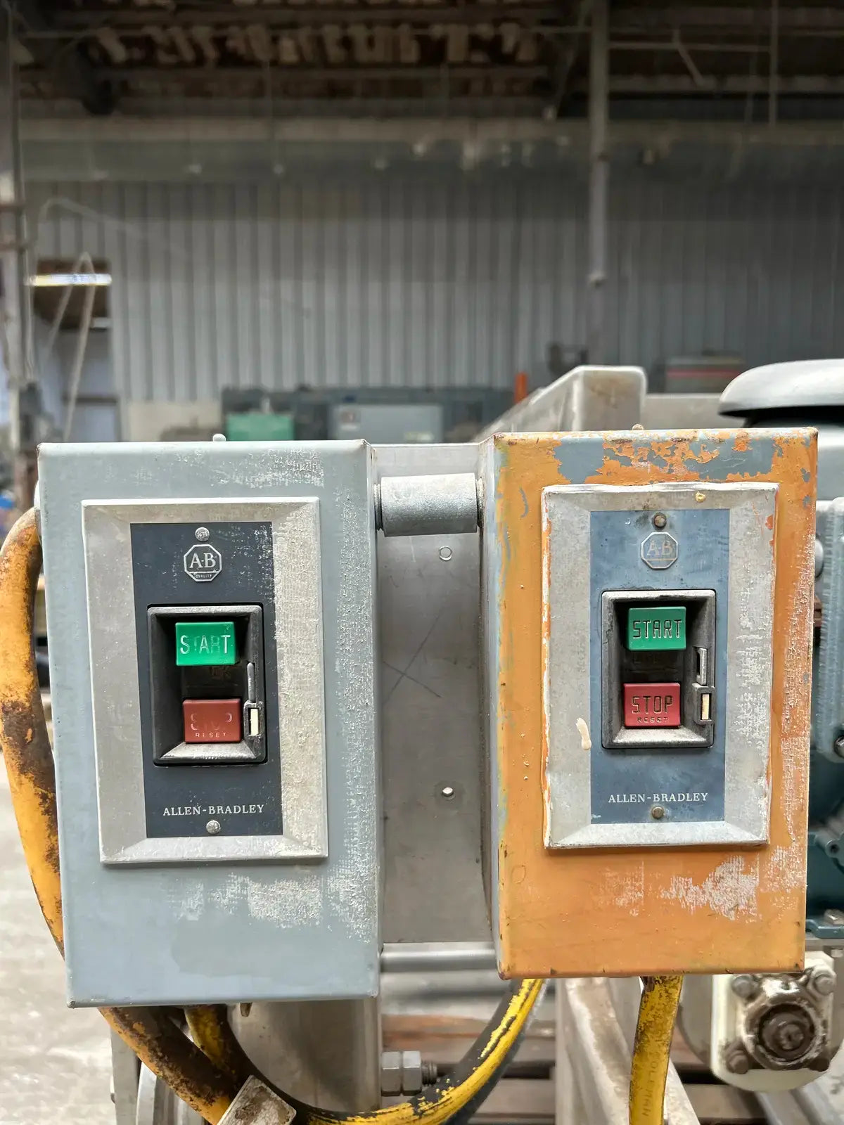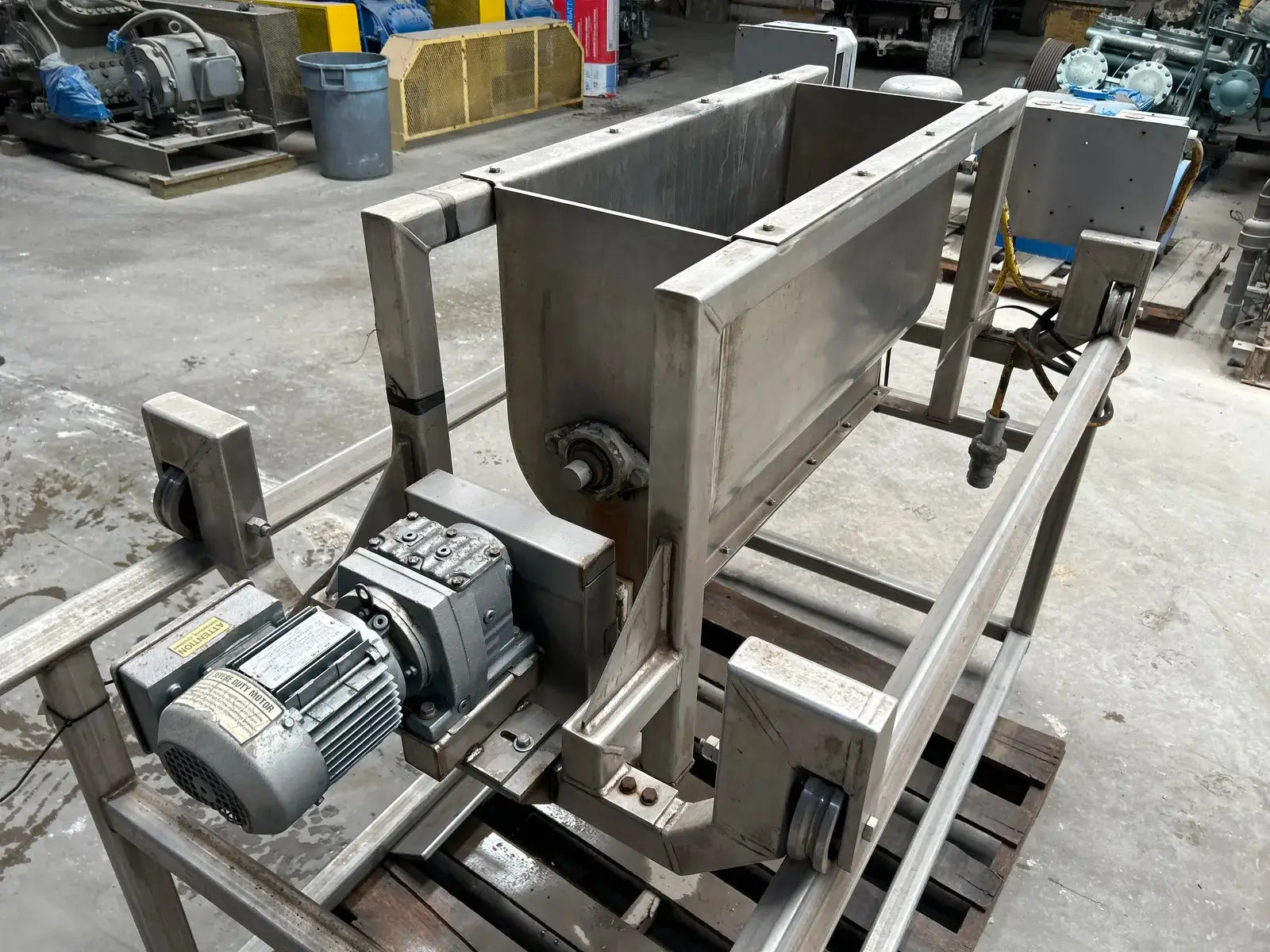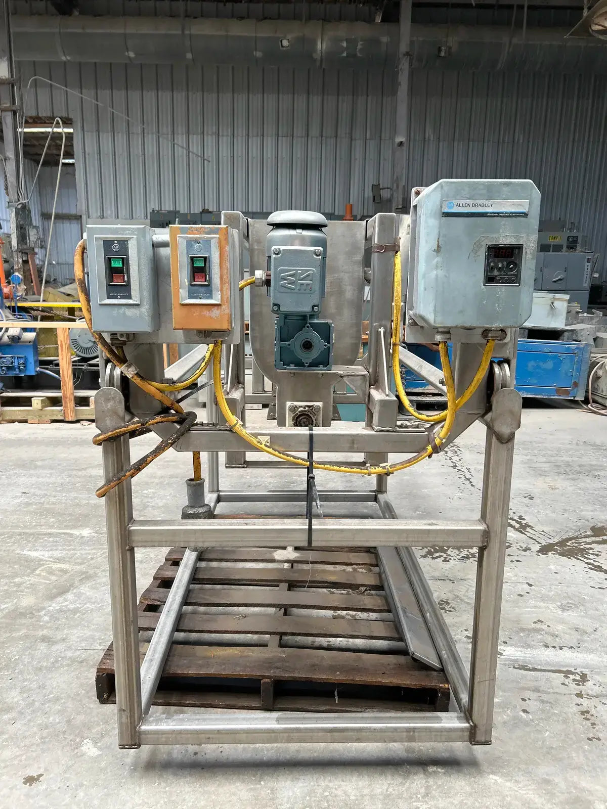Fedco Stainless Steel Topping Applicator. Has two agitators with drives. Hopper/agitator assembles slide length wide on track. Hopper dimensions (inside) 12 in. W, 32 in. L, 18 in. H. (Curved bottom). Has two on/off switches, on for each drive. Upper agitator switch runs straight to the motor. Lower agitator switch runs to Allen Bradley control drive, then to the motor. Control Drive: Bulleting 1333 Adjustable frequency AC Motor Drive. Allen Bradley, Cat No. 1333-AAB, Ser: B, S/N B17355, Input (3 phase) 460 volt, 50/60 Hz, 2.6 KVA, 3.3 amps. Output (3 phase): 460 volt, 60 Hz, 1.7 KVA, 2.1 amps. Dimensions of Frame: 38 in. W, 85-½ in. L, 35 in. H. Overall dimensions: 38 in. W, 85-½ in. L, 51-½ in. H.
