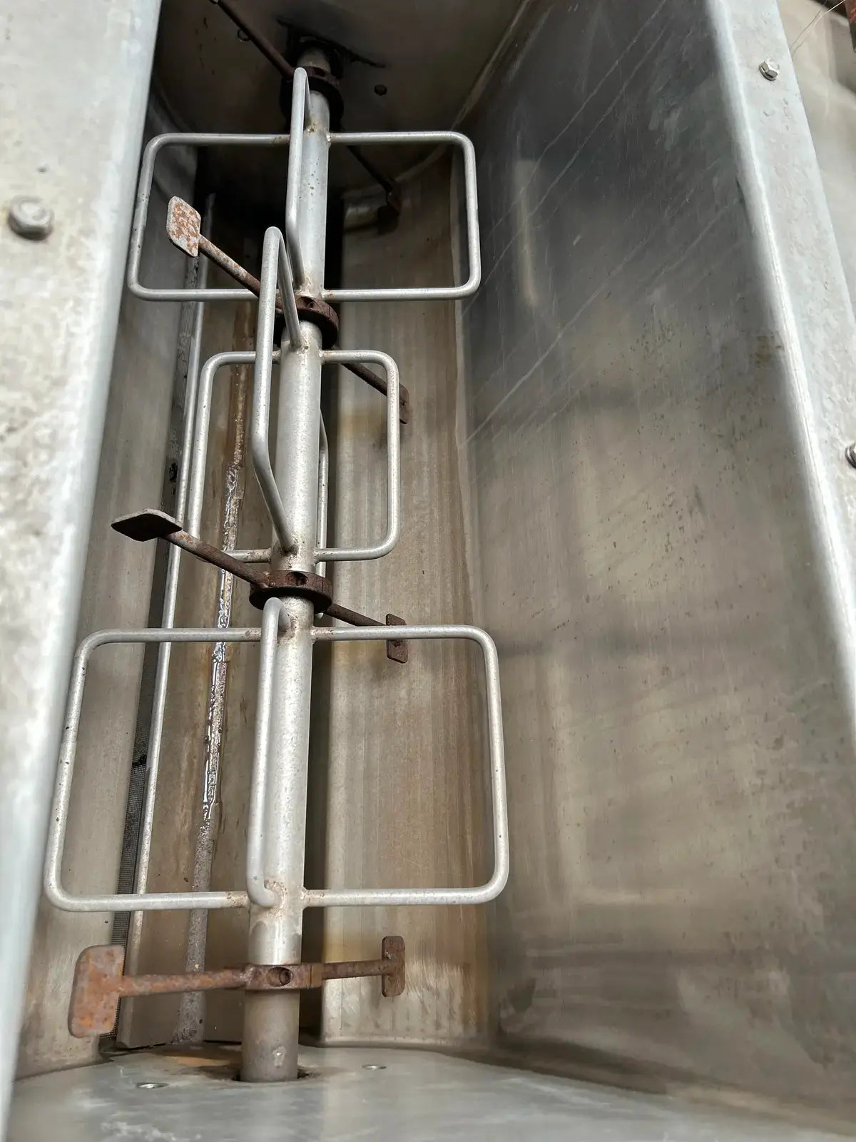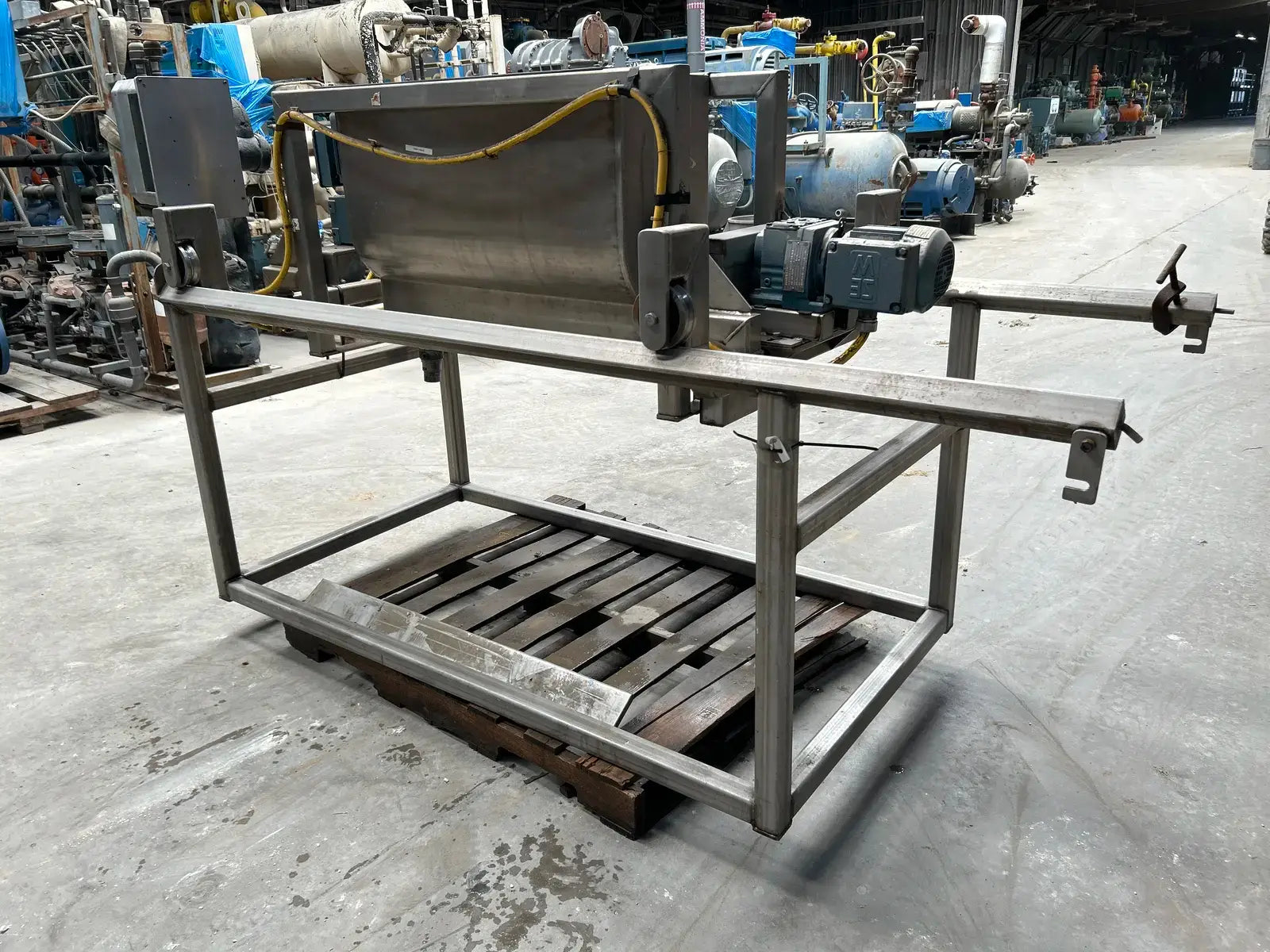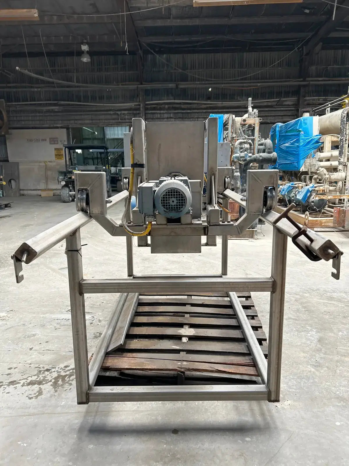 Fedco Stainless Steel Topping Applicator. Has two agitators with drives. Hopper/agitator assembles slide length wide on track. Hopper dimensions (inside) 12 in. W, 32 in. L, 18 in. H. (Curved bottom). Has two on/off switches, on for each drive. Upper agitator switch runs straight to the motor. Lower agitator switch runs to Allen Bradley control drive, then to the motor. Control Drive: Bulleting 1333 Adjustable frequency AC Motor Drive. Allen Bradley, Cat No. 1333-AAB, Ser: B, S/N B17355, Input (3 phase) 460 volt, 50/60 Hz, 2.6 KVA, 3.3 amps. Output (3 phase): 460 volt, 60 Hz, 1.7 KVA, 2.1 amps. Dimensions of Frame: 38 in. W, 85-½ in. L, 35 in. H. Overall dimensions: 38 in. W, 85-½ in. L, 51-½ in. H.