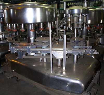 Federal stainless steel lightweight gallon bottle filler and capper, 18 valve right hand, Model G185. J4 filling valves. BWC level controller. 3 pin bottle handling equipment for one size container. Federal screw capping system with RTF cap feeder mounted on fixed height stand, cap chute, cap applier, and 5-C111 cappers.