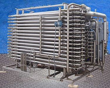 1999 Feldmeier Double Tube HTST Skid. Model: PWS. S/N: PW-1-99. 316 stainless steel construction. 3-Sections with: pasteurizer, regeneration, chiller. Previously used to heat/ sterilize 30 gpm of purified water at 250 °F. Maximum flow rate: 50 gpm. Inlet water temperature was 50 °F. Raw regeneration outlet temperature was 210 °F using 80% regeneration, heated to 250 °F using saturated steam. Hold time a 250 °F was 20 seconds. Cooked regeneration outlet temperature was 90 °F, cooled to 55 °F using 45 °F chilled water. Steam requirements: 1000 lb/hr. Chilled water requirement: 200 gpm @ 44 °F. Pasteurizer consists of 16 tubes with inner tube dimensions of 1-1/2 in. dia. x 9 ft. 2 in. L and outer tube dimensions of 2-1/2 in. dia. x 8 ft. 11 in. L. Regeneration consists of 60 tubes with inner tube dimensions of 1-1/2 in. dia. x 9 ft. 2 in. L and outer tube dimensions of 2 in. dia. x 8 ft. 11 in. L. Chiller consists of 24 tubes with inner tube dimensions of 1-1/2 in. dia. x 9 ft. 2 in. L and outer tube dimensions of 2-1/2 in. dia. x 8 ft. 11 in. L. Overall dimensions: 13 ft. L x 96 in. W x 94 in. H. (ACN250-300).