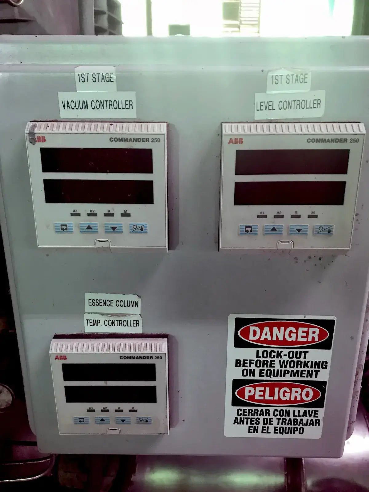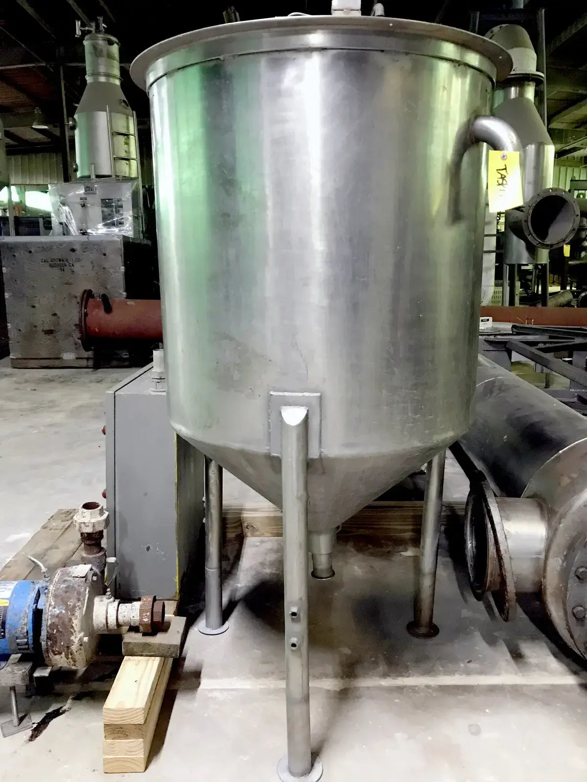 FEMCO Food Equipment Manufacturing Company 2-Stage Puree Concentrate Evaporator. FEMCO Hollister, CA. Serial no.: 0338-85. Made in Italy. Circulated 1st Effect , Vapor Body and Q 6 x 4 Durco Recirculation Pump, 15hp. 2nd Effect features an L&H Rotary Coil Style tank evaporator., No Pump w/ and Essence Recovery Column w/ Tube Nest; System w/ Various Pumps, Tanks and Controls, Last Running Strawberry Puree 144 T.