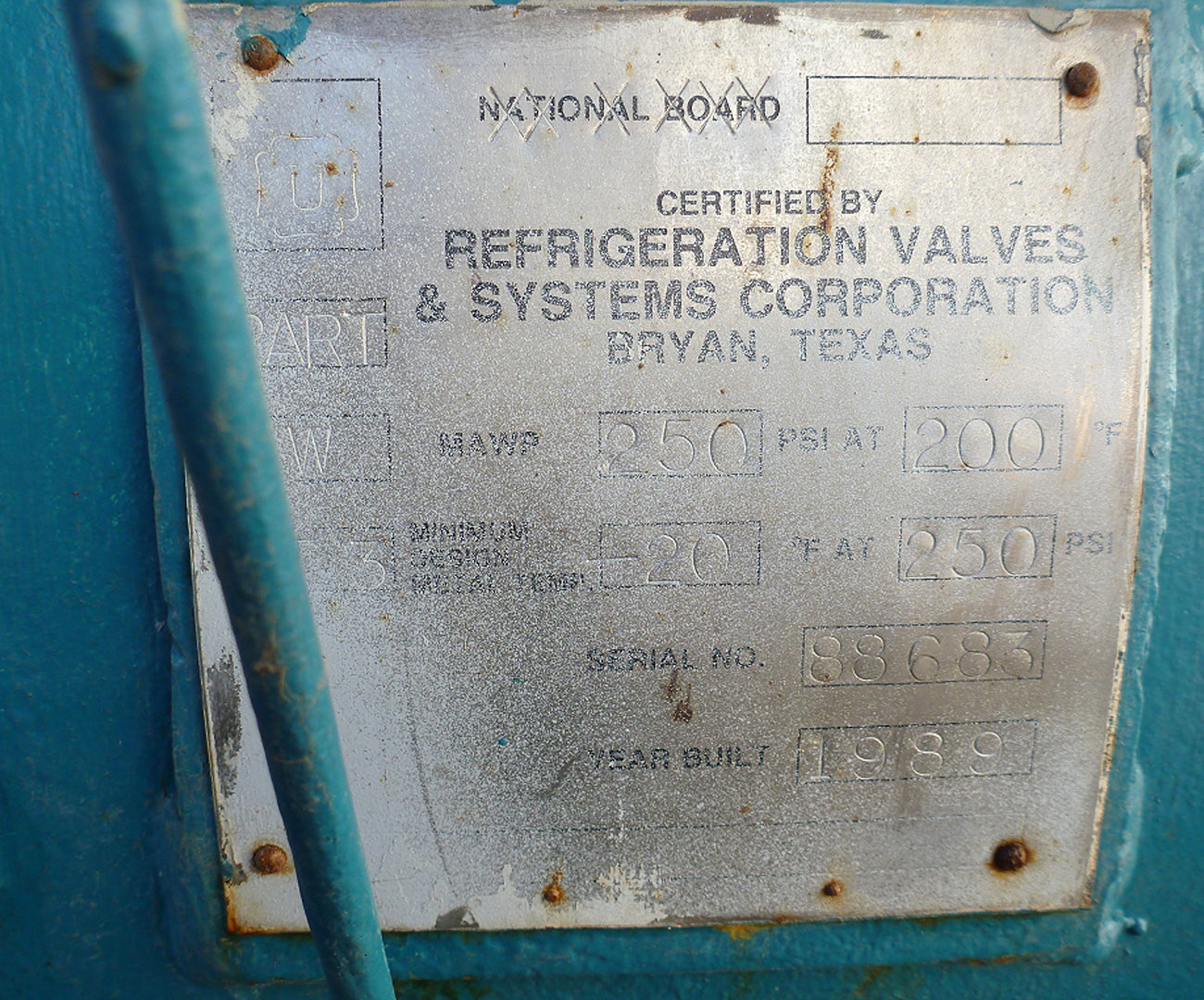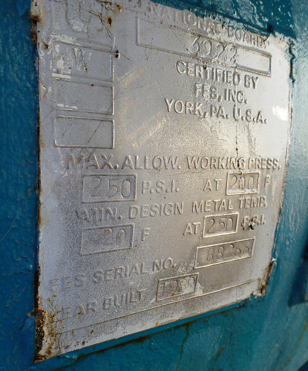 FES Screw Compressor Package. Model: 1160B. S/N: 89-0039-0101. FES Contract No. 89-0039-0301-09. Compressor model: 1160B-LE. S/N: 3211375. FES equivalent Mycom model 320L. The capacity of this booster is 525tons at 401bhp -30/+10f. TECO motor: 400 hp, 2300/4160 V, 87.9/48.6 A, 3565 rpm. Tank: Nat. Bd. No. 3922. MAWP: 250 psi at 200ºF. MDMT: -20ºF at 250 psi. S/N: 88266.