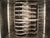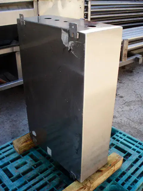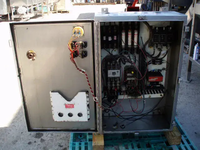 Fitzpatrick Company Guilo River FitzMill with Control Panel. Stainless steel hopper infeed: 1 ft. 4 in. L x 1 ft. 3 in. W x 2 ft. 4 in. H. Roller dimensions: 1 ft. 2 in. dia. x 1 ft. 2 in. L. Hopper input (19) ¾ in. teeth cutters. 8 in. output blade cutters. Siemens Electric Motor, 25 hp, 1740 rpm, 230/460 V, 59.2/ 29.6 amps, 60 Hz, 3 phase. Driver pulley diameter: 8 in. Driven pulley diameter: 5-1/8 in. Pulley ratio: 1.6 .Final rpm: 2784. Electric Motor, 7.5 hp, 1760 rpm, 230/460 V, 21/10.5 amps, 60 Hz, 3 phase. Drive, Model: MFC-25171-RC, S/N: 180DG28A, 7.5 hp, 7.6 ratio, 230 V. Hoffman control panel enclosure: Westinghouse Electric Corporation controls. (1st) Cat. A200M3CAC. Style: 179C920G15. 90 amps 230 460/575 voltage. 30/50 hp, polyphase. (2nd) 200/230 voltage 460/575 voltage. 7-1/2/10 hp. polyphase. Heavi-Duty Electric. Cat no. W250. 50/60 Hz. Overall control panel dimensions: 2 ft. L x 1 ft. W x 3 ft. 3 in. H. Overall FitzMill dimensions: L. 8 ft. 3 in. x W.4 ft. 3 in. H.10 ft. 11-1/2 in.