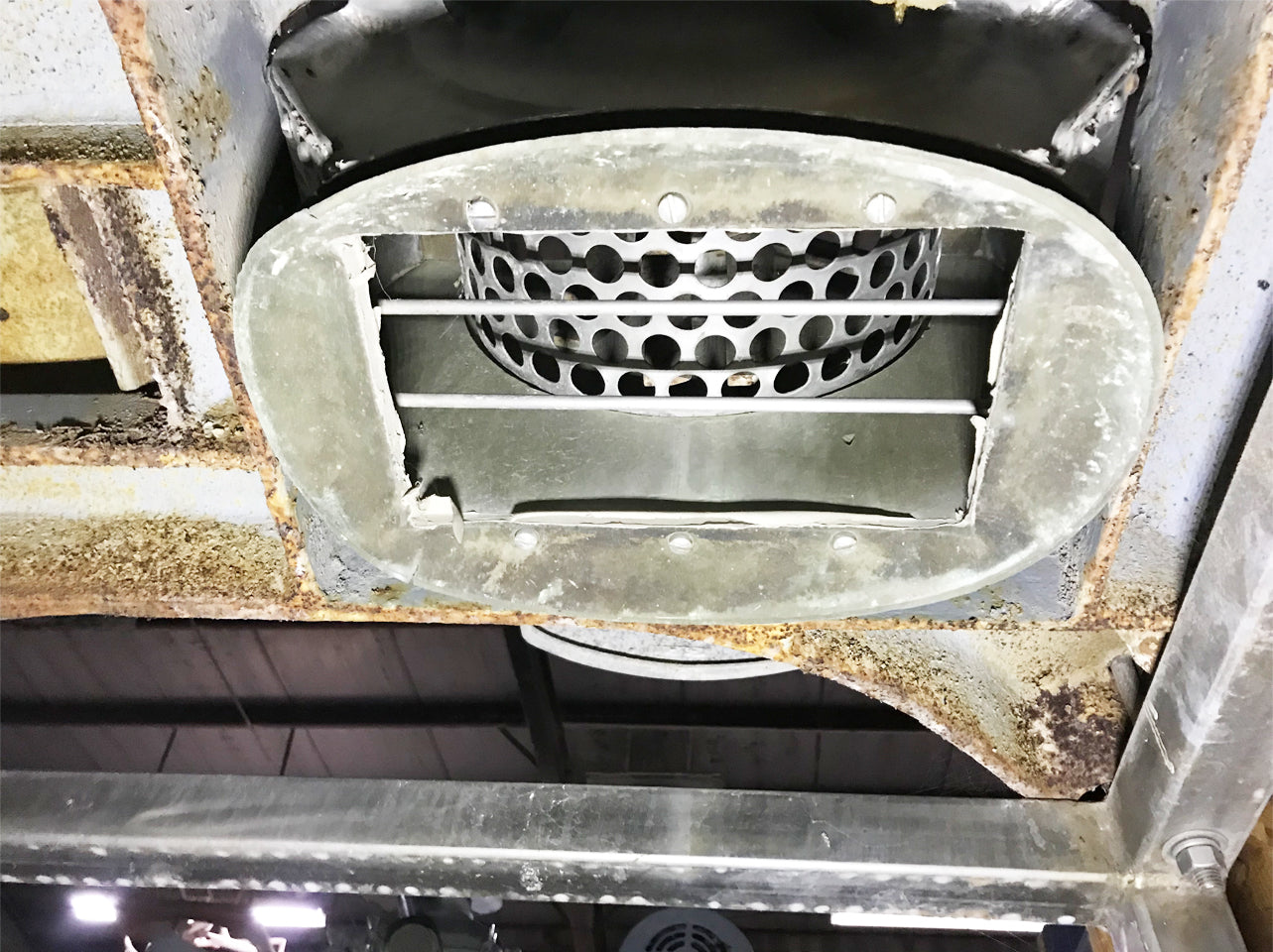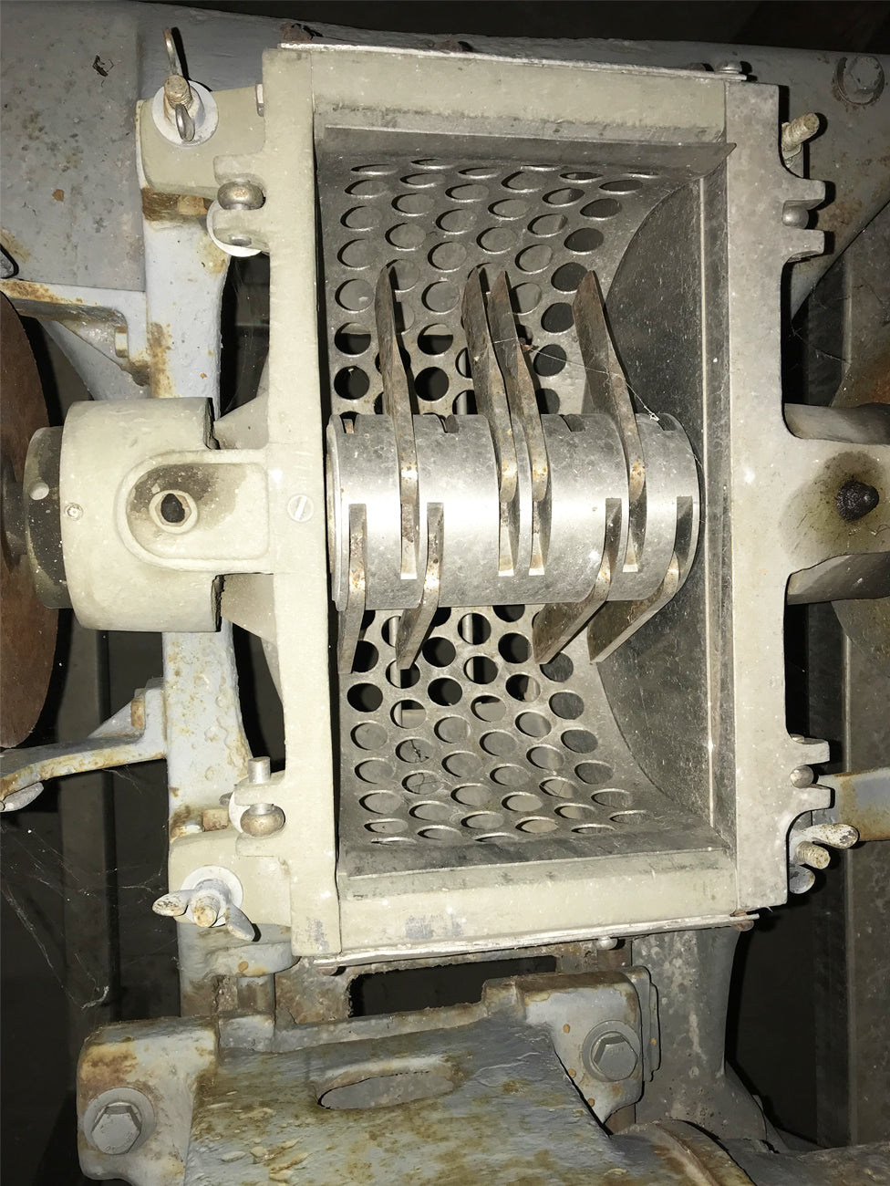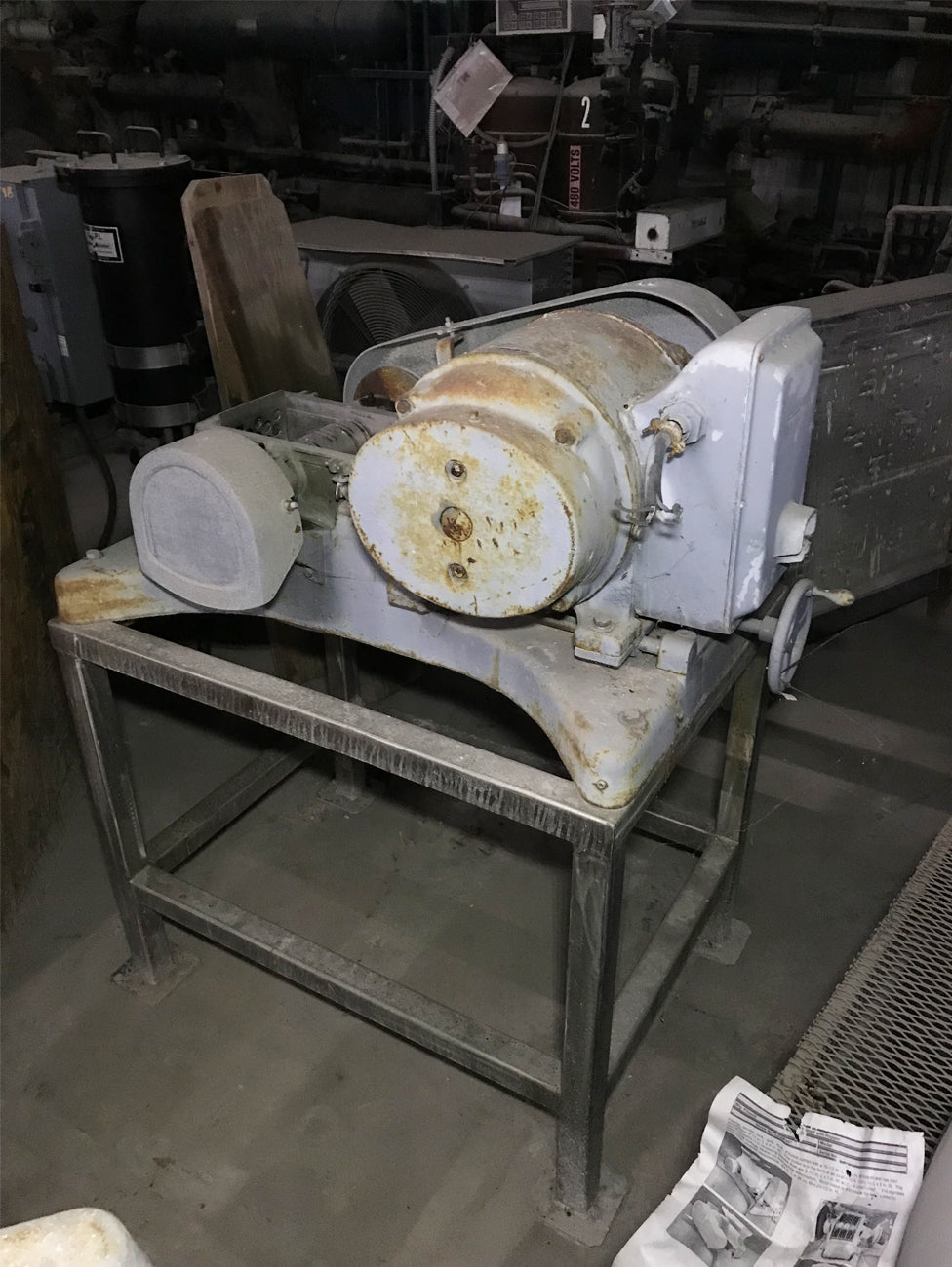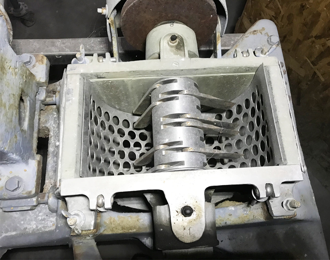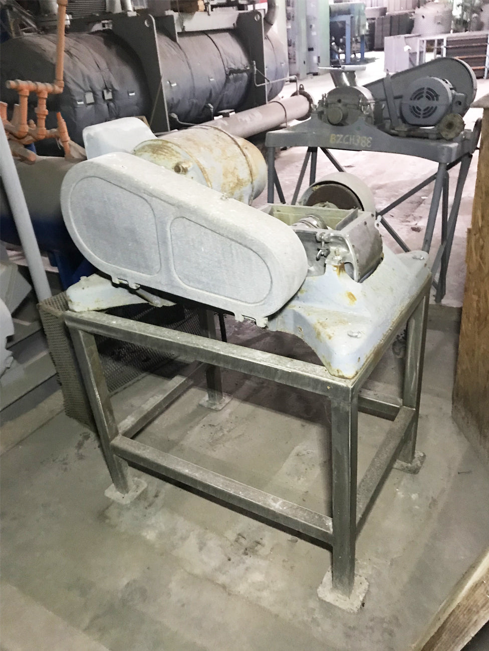 Fitzmill with Hopper. Model: DAS06. S/N: N/A. Chopping blades: (16) 3-1/2 in. L x 1 in. W; 316 stainless steel. Hopper: 16-1/2 in. L x 10 in. W. Inlet dimensions: 11 in. L x 6 in. W. Outlet: oval; 12-1/2 in. L x 9 in. W. Dual voltage motor; no nameplate information, currently on a 1:1 pulley ratio but speed can be reduced to 2.3:1 ratio. Motor base adjustable for easy access to drive belts. Overall dimensions: 43 in. L x 26 in. W x 23-1/2 in. H.