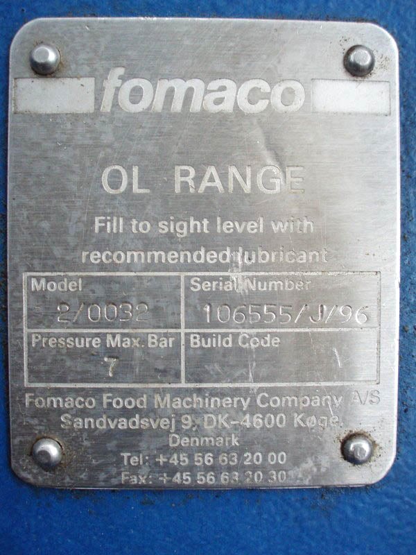 Fomaco Positive Displacement Pump. Model: 2/0032. Maximum working pressure: 100 psi. Inlets/Outlets: (2) 2 in. diameter I-Line fitting. Overall dimensions: 1 ft. 1-1/2 in. L x 9-7/8 in. W x 10-3/4 in. H.