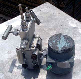 Foxboro Pressure Transmitter. Model: 823DP-I3S1SH2. Maximum working pressure: 3000 psi. Cal: 4 mA = 0 in. H2O. Range: 20 mA = 400 in. H2O. Power supply: 12.5-65 VDC. Overall dimensions: 9-1/2 in. L x 5 in. W x 9 in. H.