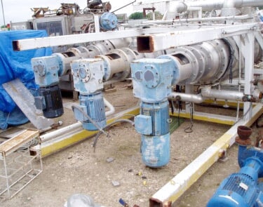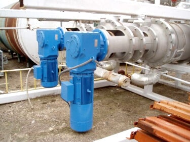 (5) 1991 FranRica Scraped Surface Heat Exchangers. S/N RFS94-HX-01, RFS95-HX-02, RFS70-HX-02, RFS95-HX-01. Previously owned and operated by Ragu Foods in Stockton, CA. (3) Water-cooled, (2) Ammonia-cooled units. Heating surface area: 50 sq. ft. MAWP @ 375 °F: 150 psig. MDMT @ 150 psig: 0 °F. Sew-Eurodrive Motor, 25 hp, 1760 rpm, 230/460 V, 66/55 amps, 60 Hz, 3 phase. Sew-Eurodrive Gear Drive, 21.08 ratio, 83 rpm (final), 18,055 in-lbs of torque. Inlets: (1) 4 in. dia. I-line fitting (product), (1) 1-1/2 in. dia. pipe (water), (1) 2 in. dia. pipe (ammonia). Outlets: (1) 4 in. dia. I-line fitting (product), (1) 2 in. dia. S-line fitting (water), (1) 1 in. dia. pipe (ammonia). Overall dimensions: 17 ft. 7 in. L x 10 ft. 6 in. W x 101 in. H.
