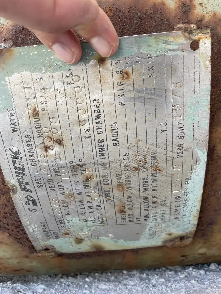 Frick Ammonia Vertical Ammonia Oil Separator( 20 in x 50 in 86 Gallons) Tank National Board Number: 53-SB. Separator Estimated Gallons: 86 Gallons. Design Temperature: -20 @ 300 F. Previous Refrigerant: Ammonia. Overall Vessel Dimensions(in): 20 dia x 50 H)
