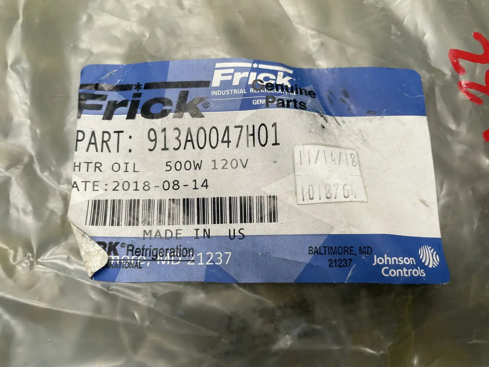 Frick Oil Heater. Part No:913A0047H01. 500 Watts. 120 Volts.