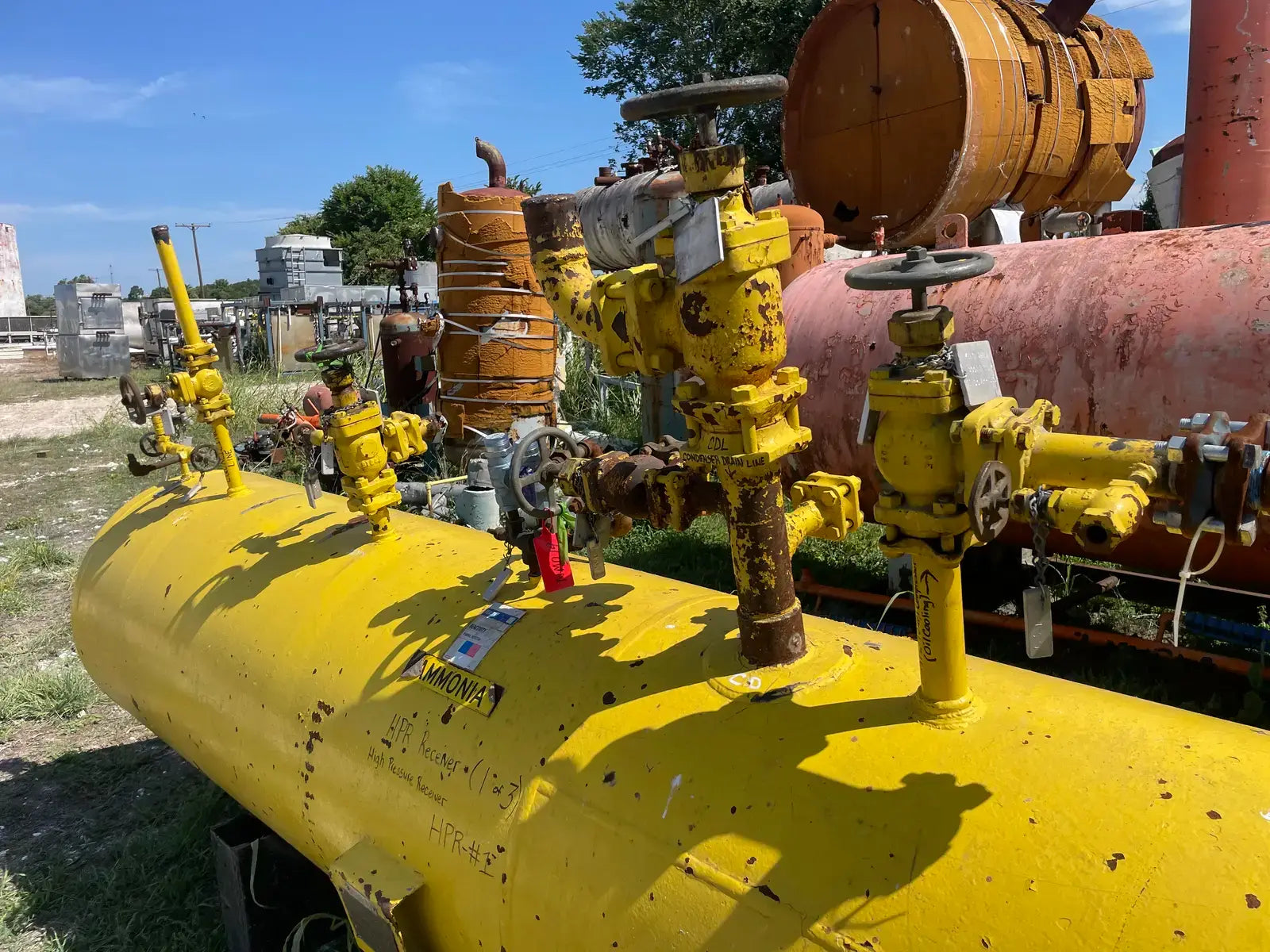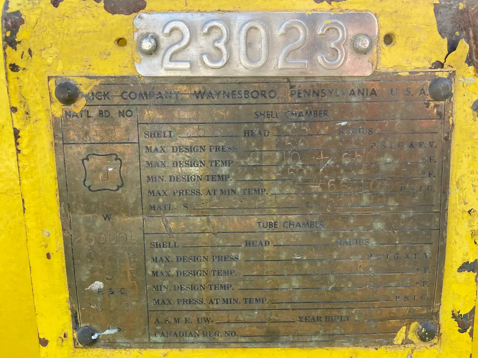 Certified by Frick Ammonia Horizontal Receiver. National Board: 28597. Max Design Pressure: 250 PSIG. Max Design Temperature: 650 F. Min Design Temperature: -50. Year Built: 1964.