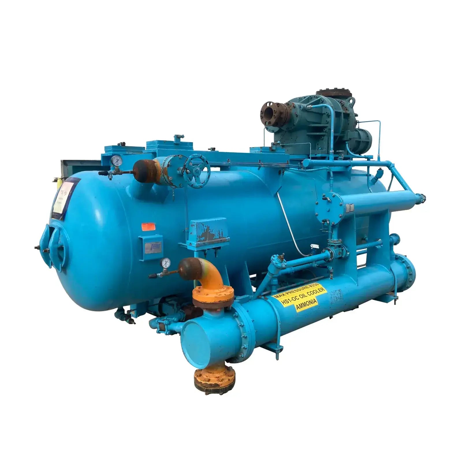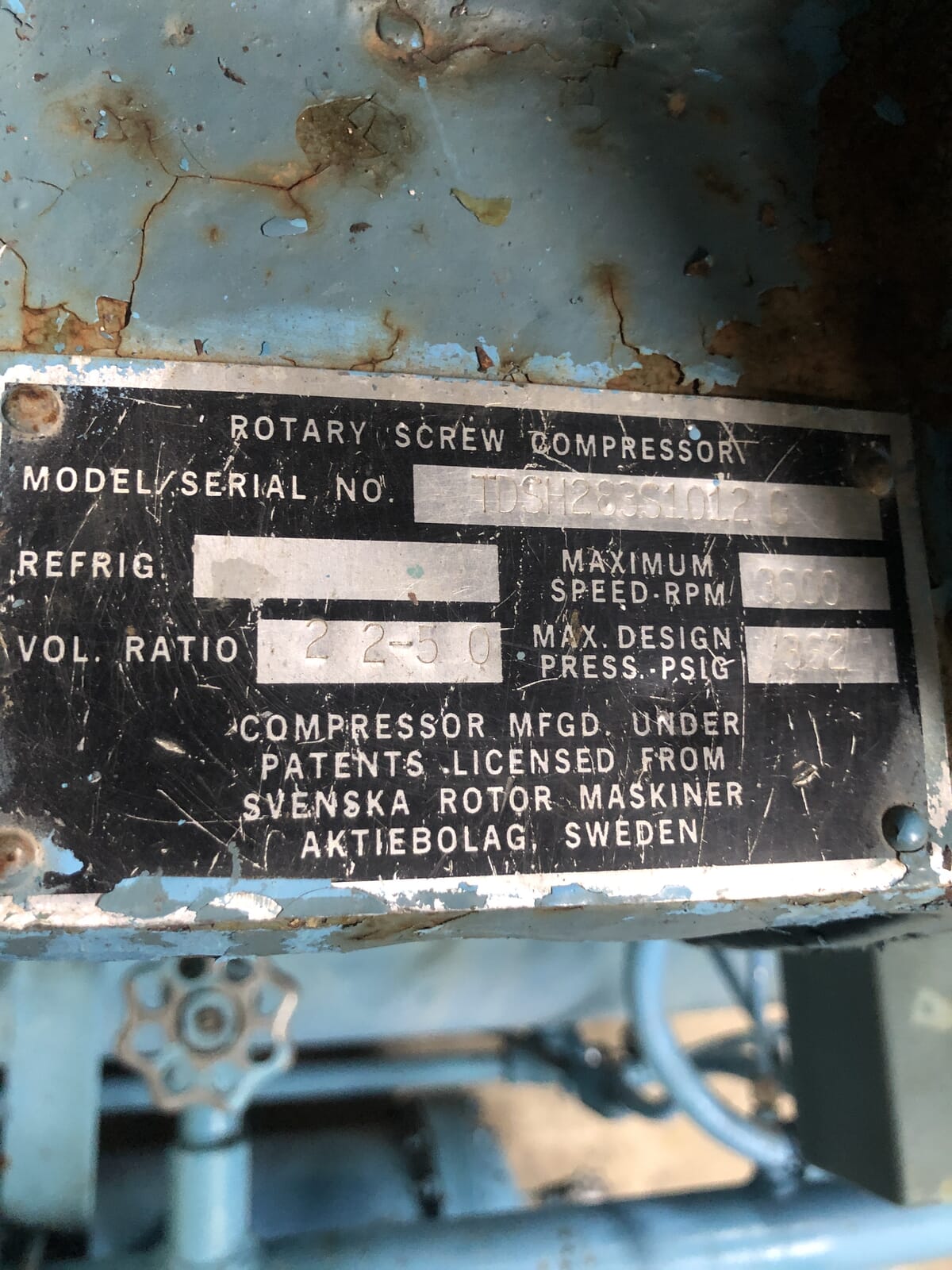 The bare Screw Compressor & Motor are not available and have been removed and sold separately. The package is for a Frick TDSH283S Bare Screw Compressor. Quantum Control Panel: No.Bm: 082289. Volts: Control 115 AC, Phase: 1, Hertz: 50/60, I.D Code: Quantum. Refrigeration Engineering Corporation Oil Separator: National Board No: 6539, Mfg Sn: M663290A, MAWP: 250 -20 @ 300F. Mfg Year: 1986.