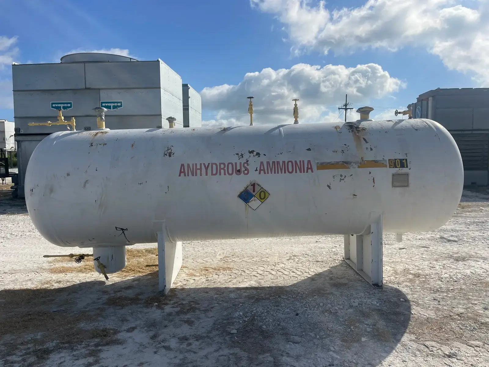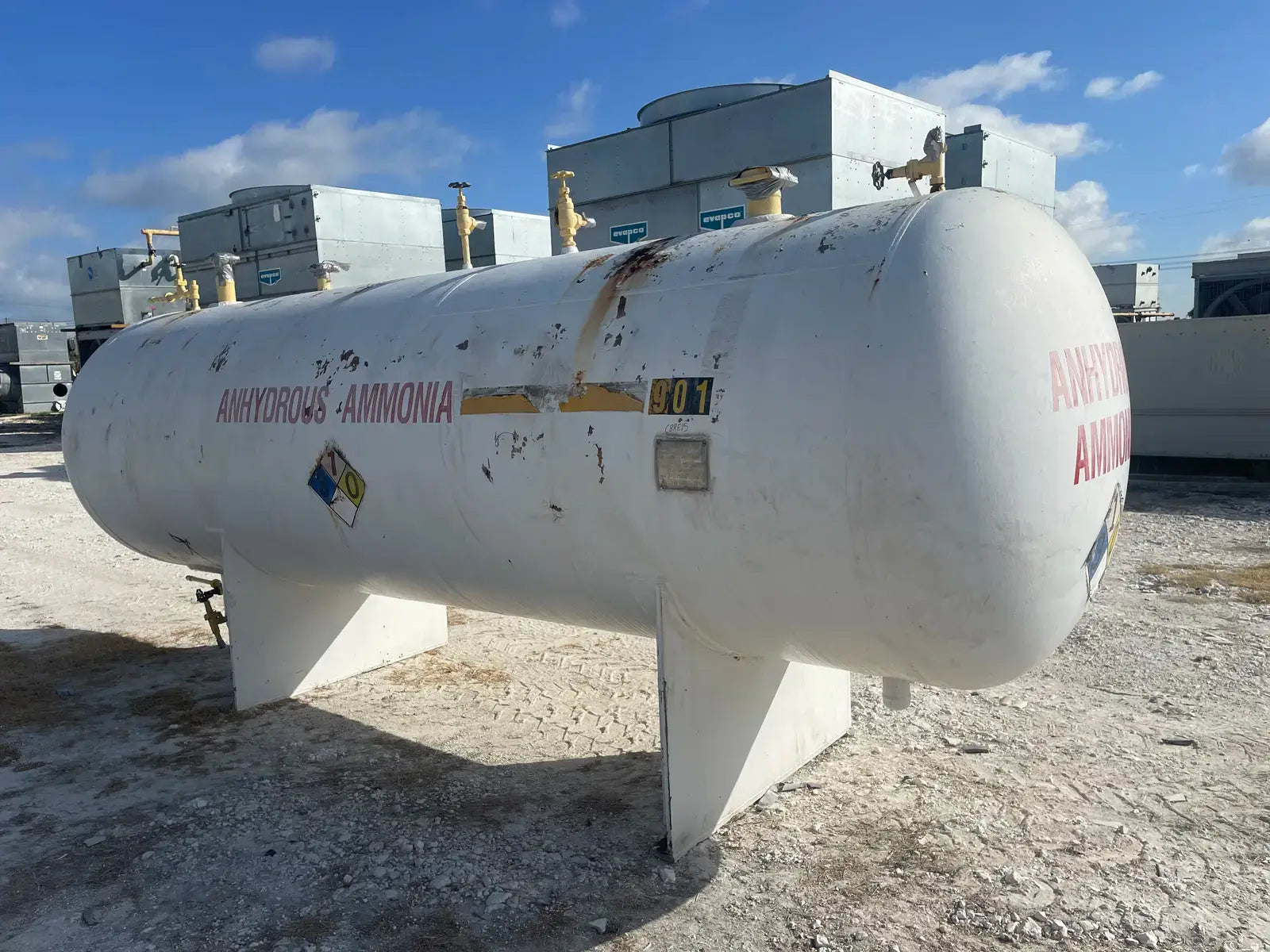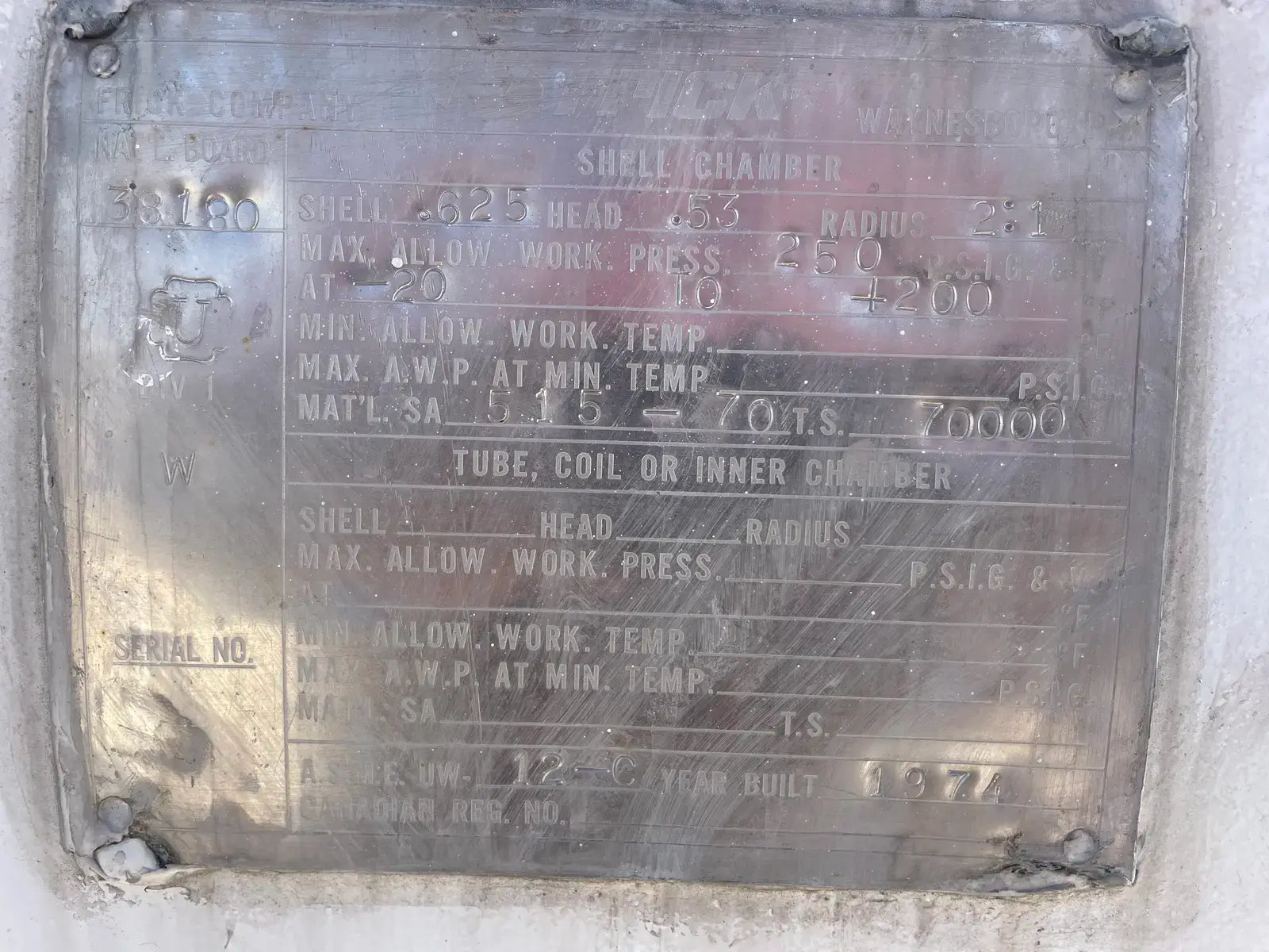 Frick Ammonia Horizontal Receiver. National Board: 38180. MAWP: 250 PSIG @ -20 F. MDMT: -20 F @ +200. Year Built: 1974. MAT'L SA: 515 - 70 T.S 70000. A.S.M.E UW- 12-C. Shell .625. Head: .53 Radius: 2:1. Overall Vessel Dimensions: 55"Dia X 200"L. Estimated Capacity: 2435 Gallons.