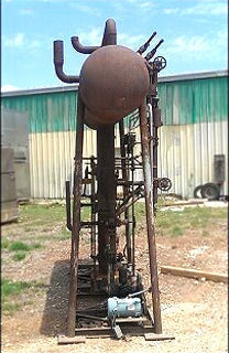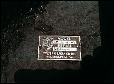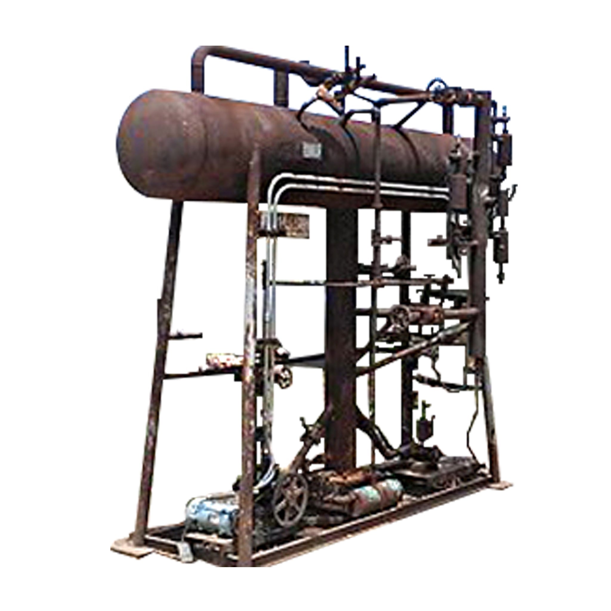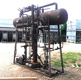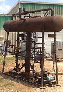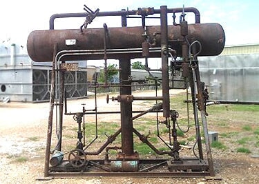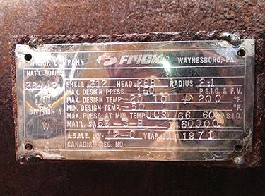 Frick Horizontal Ammonia Recirculator Package. Vessel built by the Frick Company Waynesboro, PA USA. Nat’l Bd.: 36443. ASME UW-12-C. Year: 1971. CRN: N/A. MAWP: 150 PSIG / F.V. at -20 to +200F. MDMT: -50F at 60 PSIG. UCS 66. Estimated capacity: 275 gallons. Walter H. Eagan Co. Inc. Ammonia Pumps: model E-HL-924V, serial ST229268, Philadelphia PA USA. Reliance AC motor: 1HP, 115/230V, 14.2 / 7.1 amps, 60 Hz, single-phase. Overall dimensions 12 ft. 5 in. L x 4 ft. 6 in. W x 10 ft. 1 in. H.