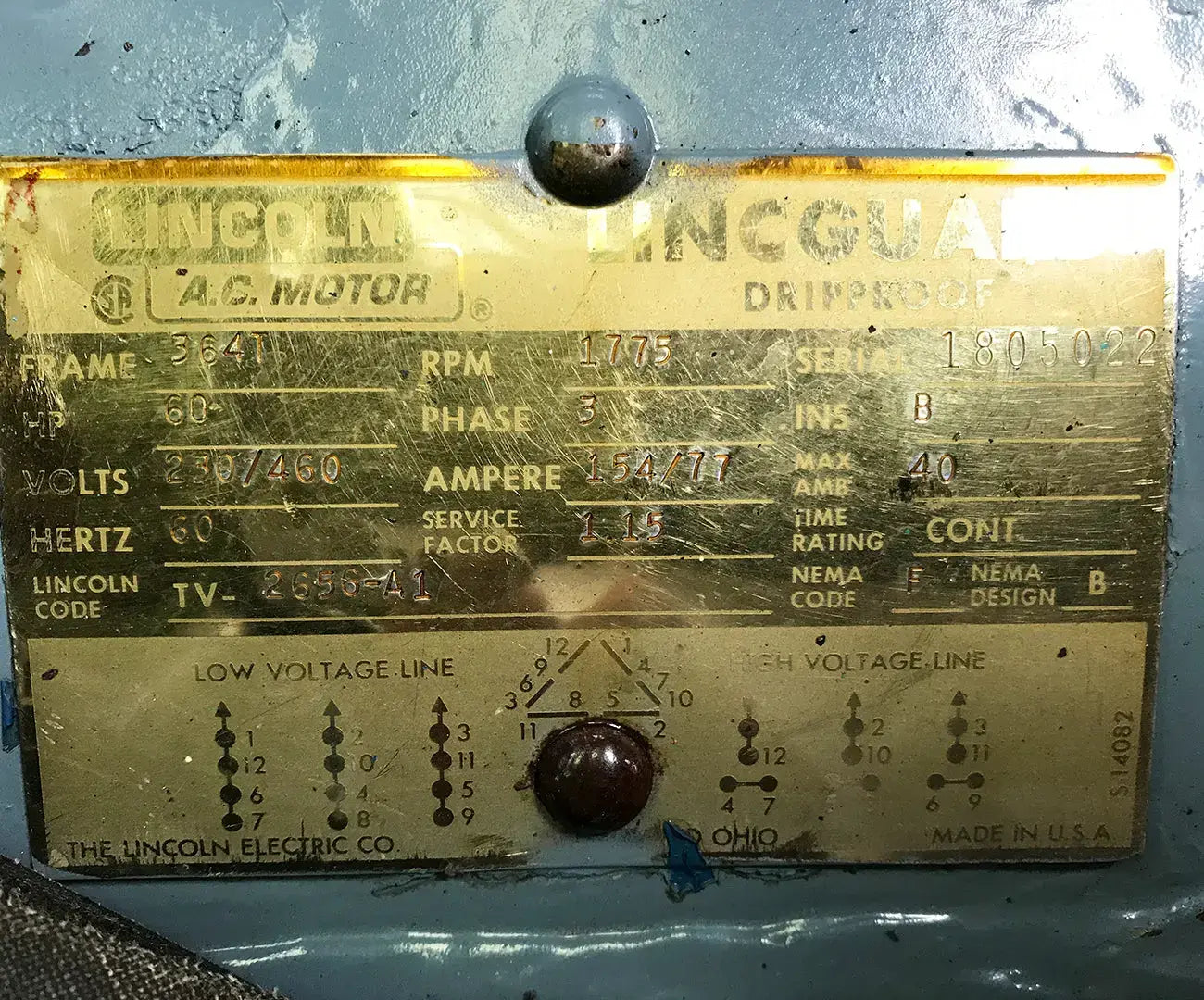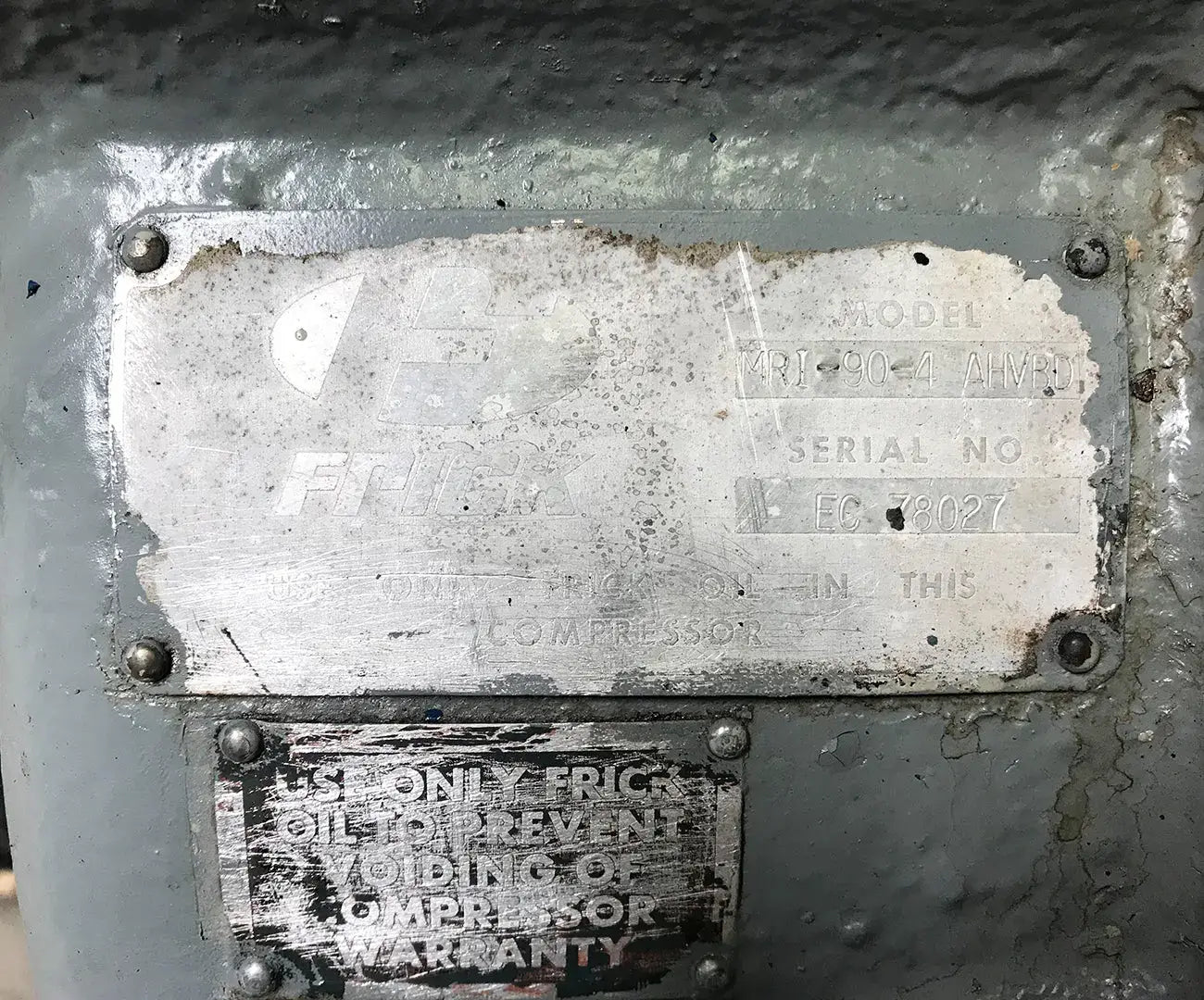 Frick MRI Reciprocating Compressor. Model: MRI-90-4 AHVBD. Serial: EC 78027. Number of cylinders: 4. Lincoln motor: 60 HP, 1775 RPM, 230/460V, 60 Hz, 3-phase, 364T Frame. Note: marked 'out of service'.