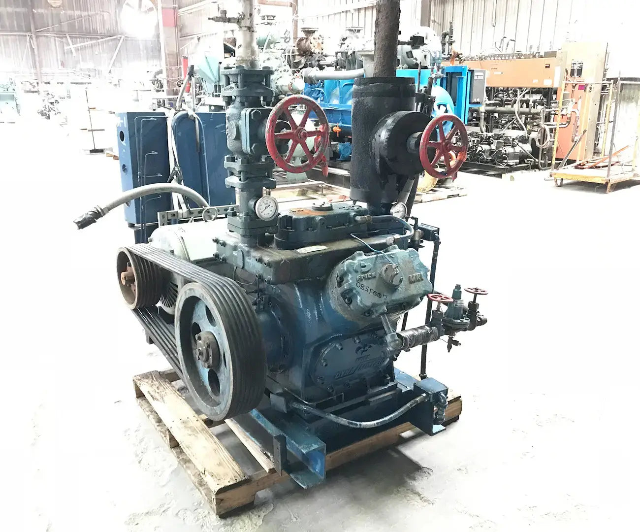 Frick MRI Reciprocating Compressor. Model: MRI.90.3.AH.VBD. Serial: EE78016. Number of cylinders: 6. Lincon motor: 75 HP, 1775 RPM, 230/460V, 60 Hz, 3-phase, 365T Frame. Previously run with ammonia refrigerant.